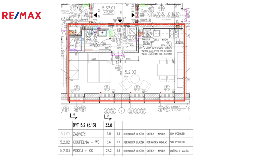 Dispozice bytu (5.2.) zahrnuje vstupní chodbu se skříní, která zajišťuje základní úložný prostor a přípravou na pračku, designovou koupelnu se sprchovým koutem, umyvadlem s koupelnovou skříňkou, WC. Z chodby se vstupuje do prostorného světlé pokoje s kuchyňským koutem, jenž disponuje moderní kuchyňskou linkou se spotřebiči - lednicí s mrazákem, troubou, indukční varnou deskou, myčkou, dřezem a digestoří. V obývací části je instalována klimatizace i elektrické předokenní rolety, které zvyšují komfort bydlení po celý rok. Internetové připojení je řešeno přes O2 / CETIN, v bytě jsou připravené datové zásuvky. Okna jsou trojskla, tudíž zaručují velmi dobrou izolaci. Topení v obývací části bude osazené v nejbližších dnech.