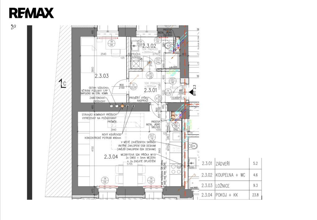 Dispozice bytu (2.3.) zahrnuje vstupní předsíň se skříní, designovou koupelnu se sprchovým koutem, umyvadlem s koupelnovou skříňkou, WC, topným žebříkem a přípojkou na pračku. Obývací pokoj s kuchyňským koutem, který disponuje moderní kuchyňskou linkou se spotřebiči - lednicí s mrazákem, troubou, indukční varnou deskou, myčkou, dřezem a digestoří. Samostatná ložnice je orientována na severní stranu. Internetové připojení je řešeno přes O2 / CETIN, v bytě jsou připravené datové zásuvky.