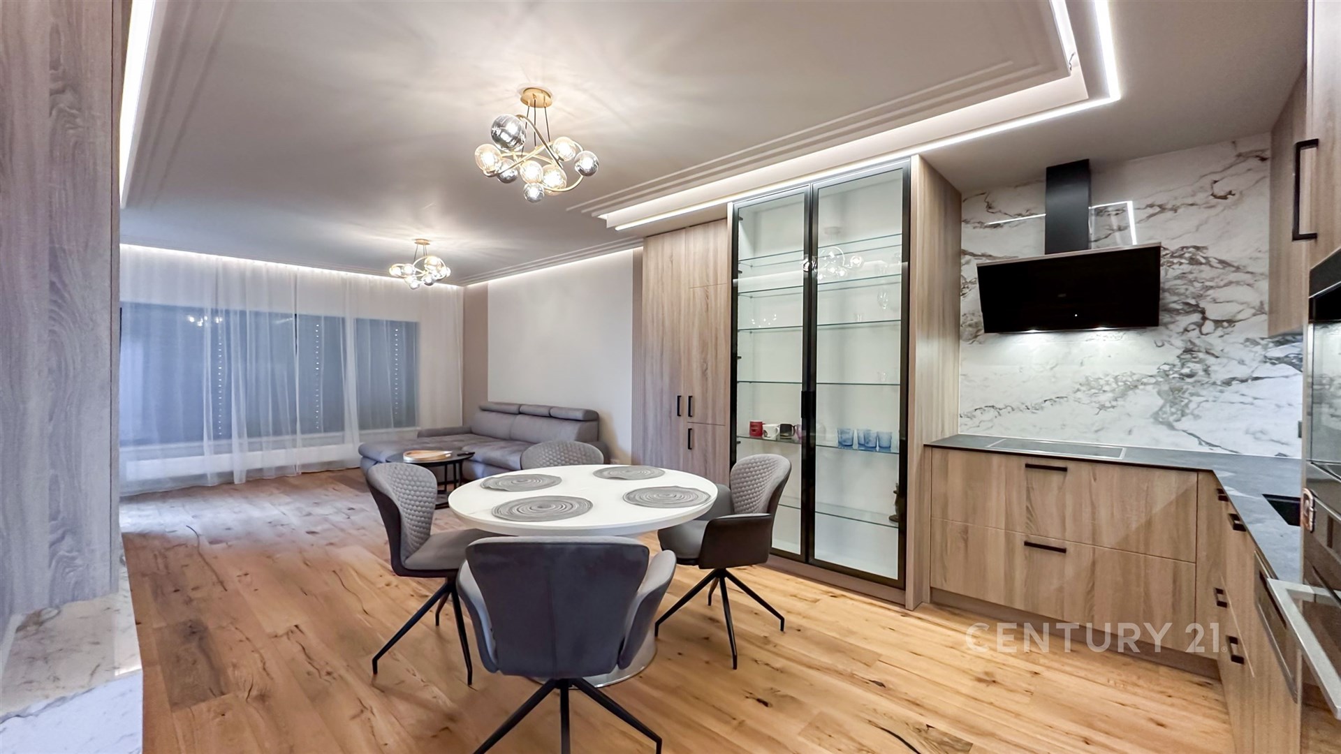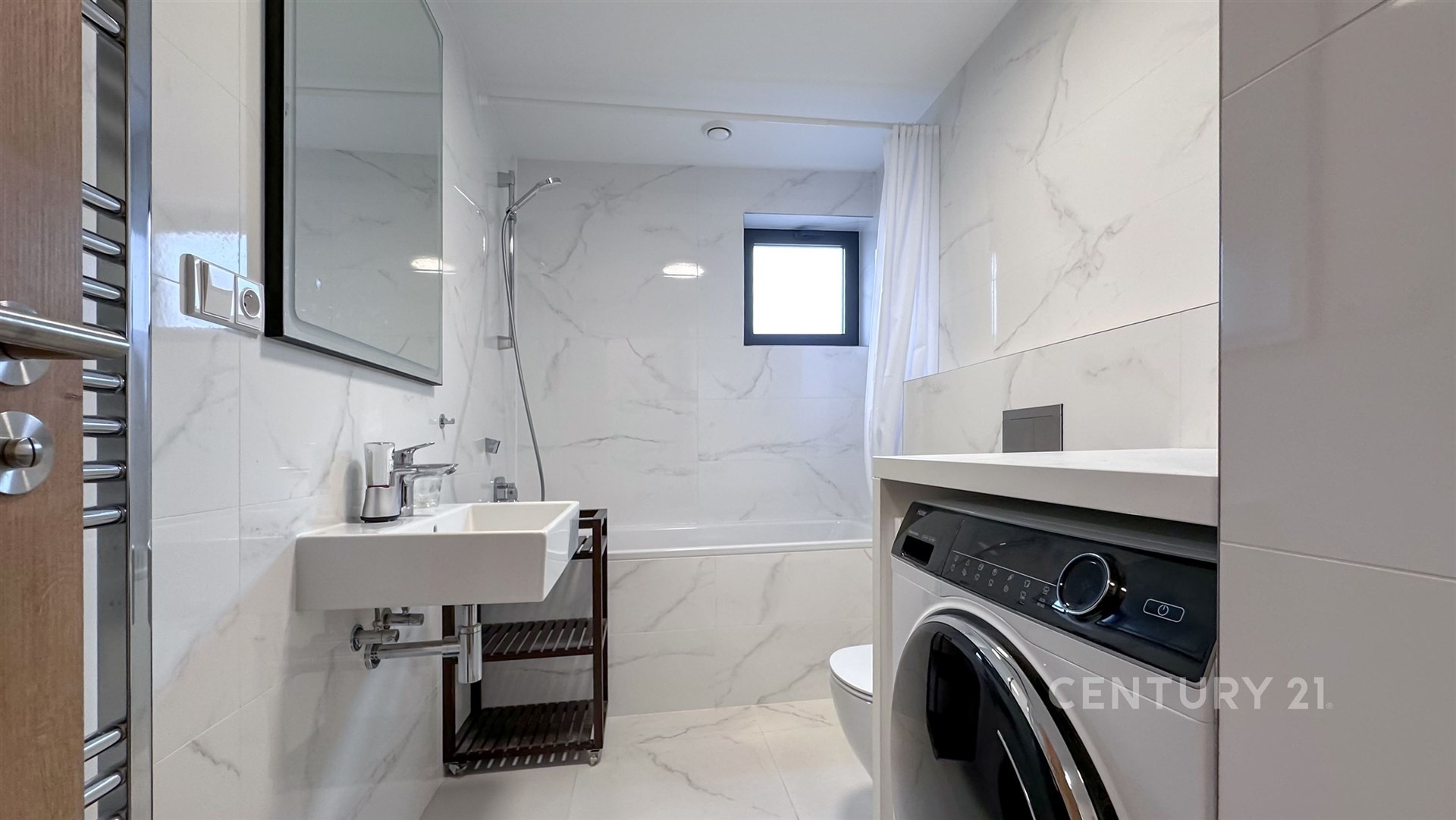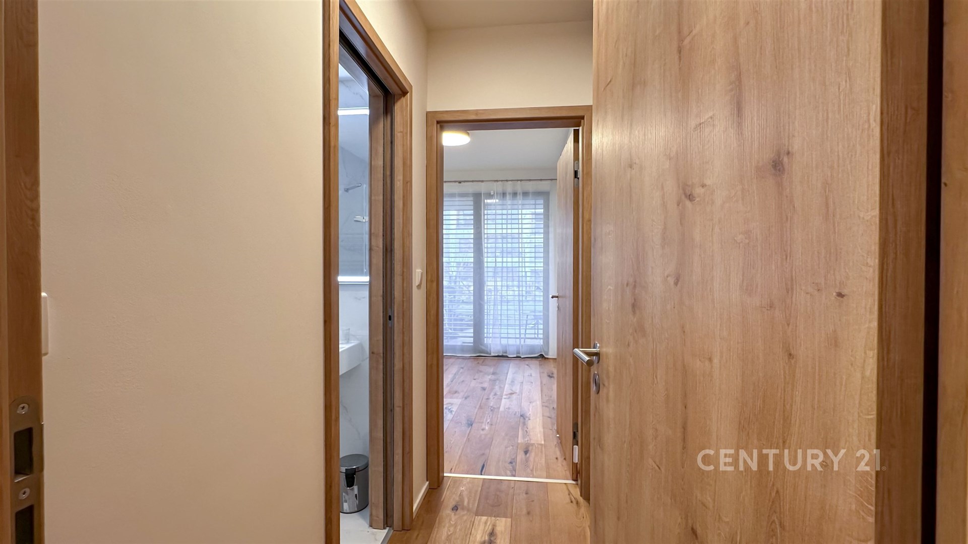 Interiér je plně zařízen moderním nábytkem a vybaven kvalitními spotřebiči: indukční varná deska, vestavěná lednice s mrazákem, elektrická trouba, digestoř, myčka nádobí a sušička. Díky severozápadní a jihovýchodní orientaci je byt příjemně světlý po celý den. Energetická třída B.