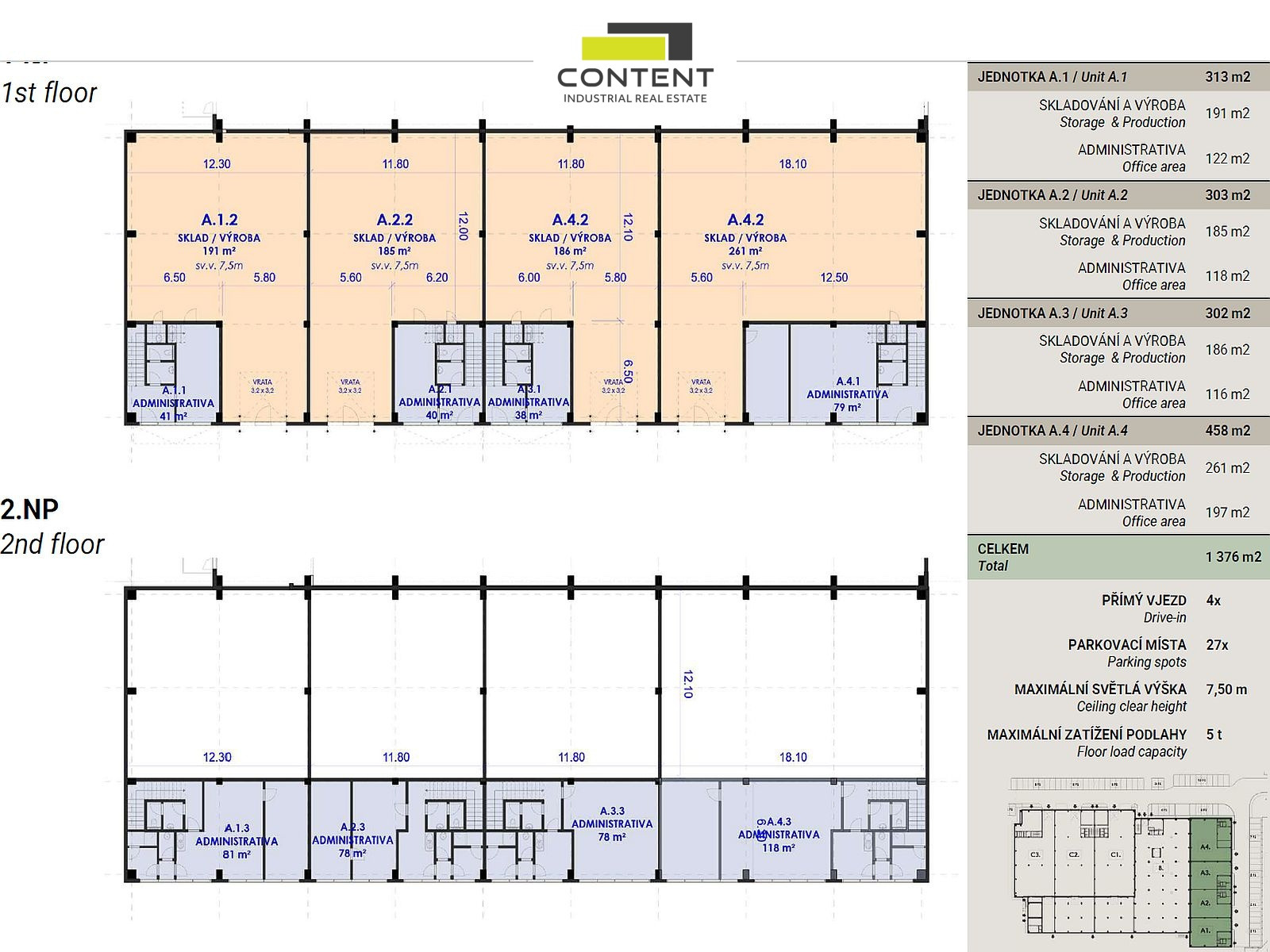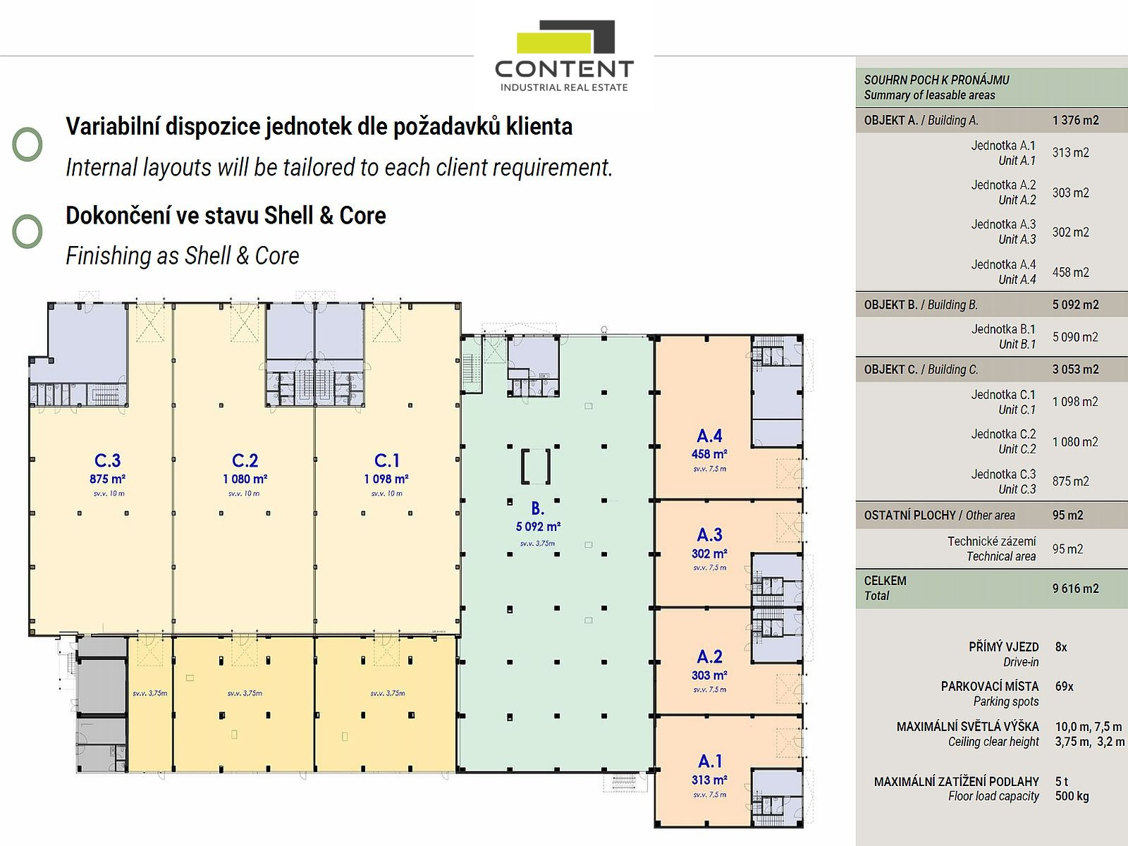 - lze rozdělit na samostatné komerční jednotky (SBU) od cca 200 m² + zázemí (A1+A2+A3+A4)