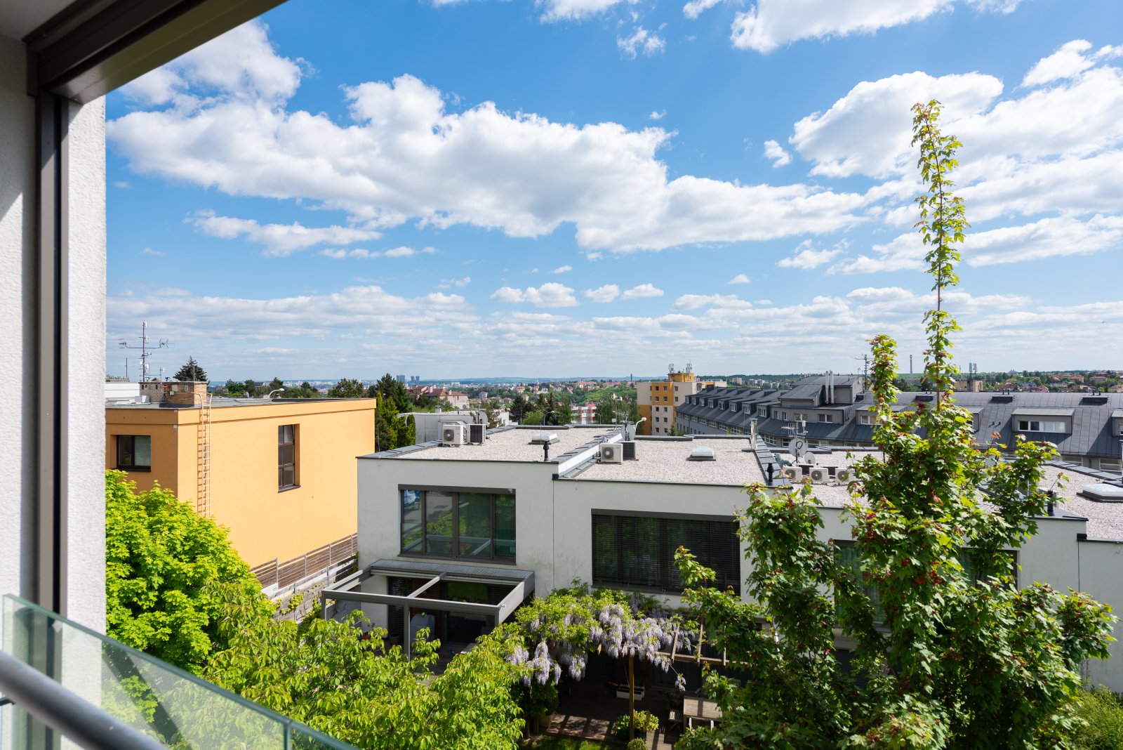 Dřevěné podlahy, vysoké dveře, designové tapety, elegantní závěsy a velká panoramatická okna s jižní orientací jsou už jen třešničkou na dortu. Malá terasa, na kterou se vstupuje z obou místností, nabízí dostatek soukromí, místa na pěstování bylinek a máte připravené již posezení s volným výhledem na smíchovské kopce.