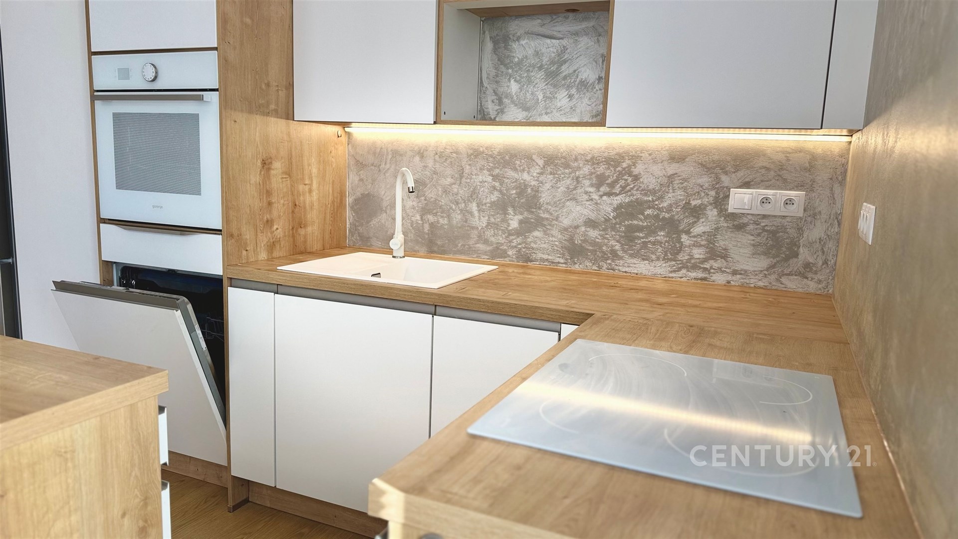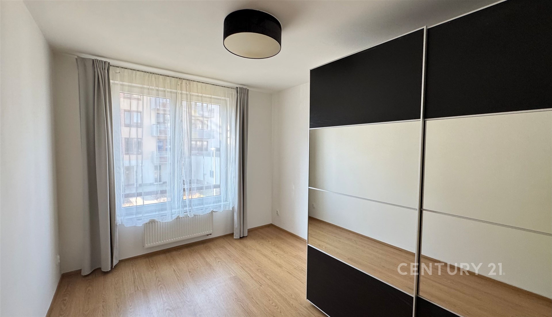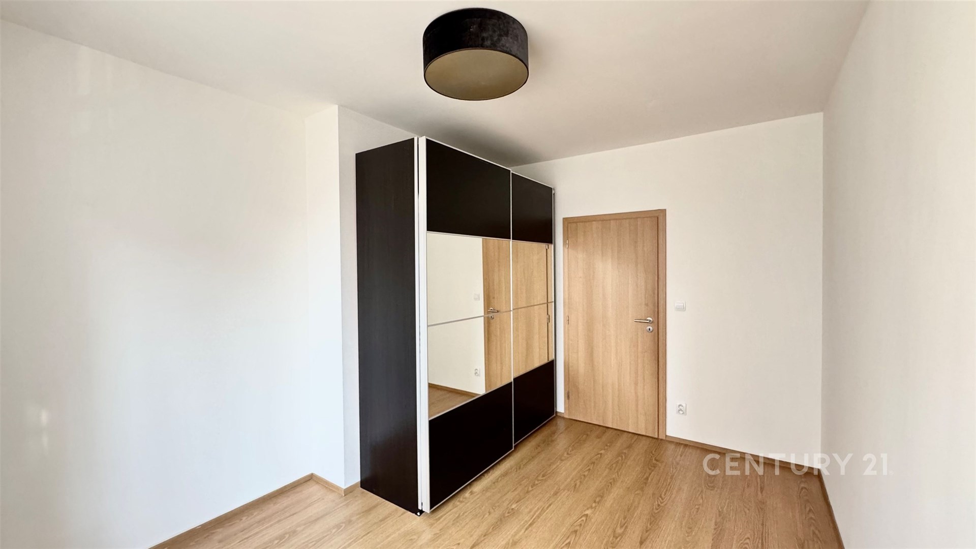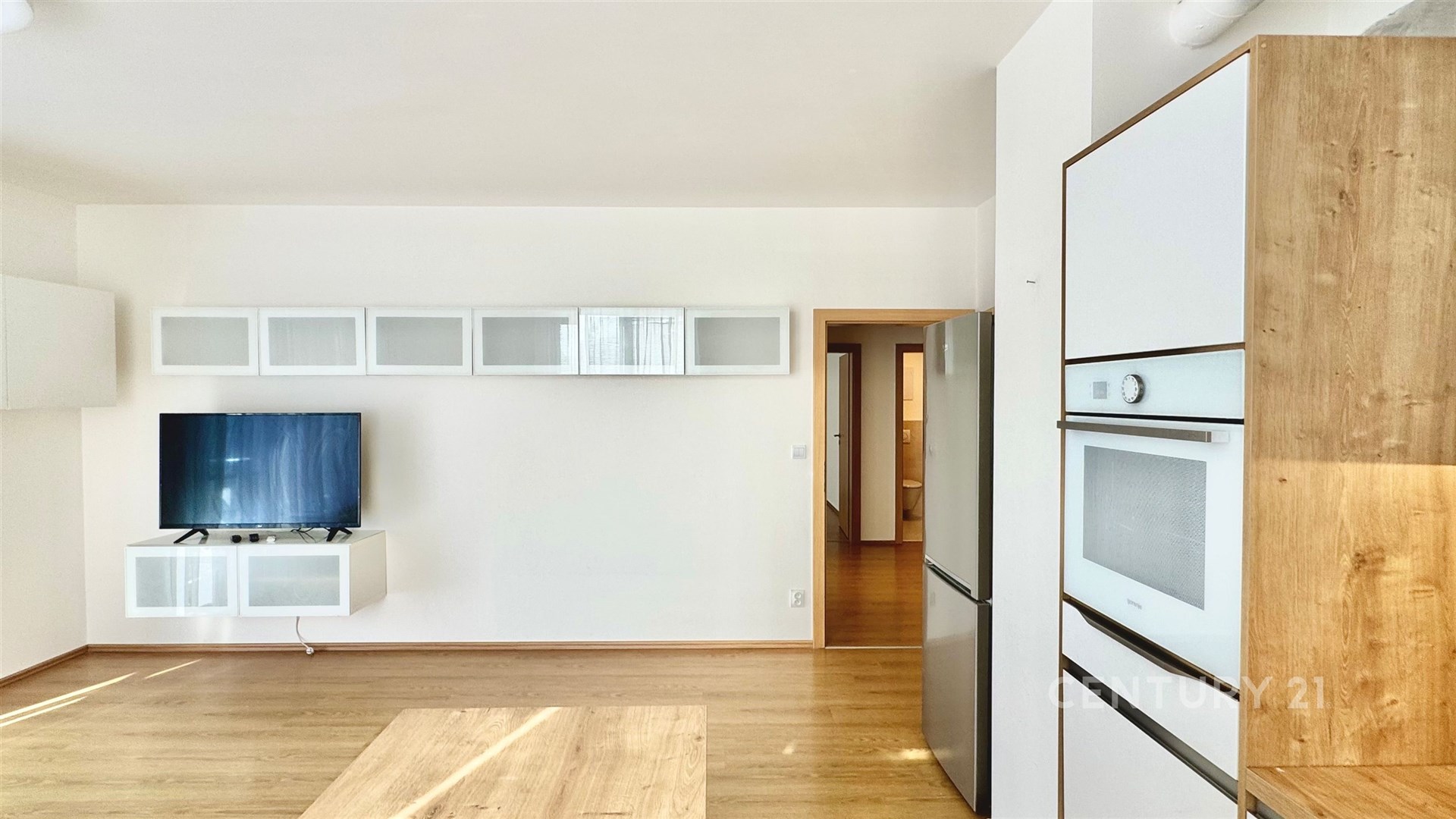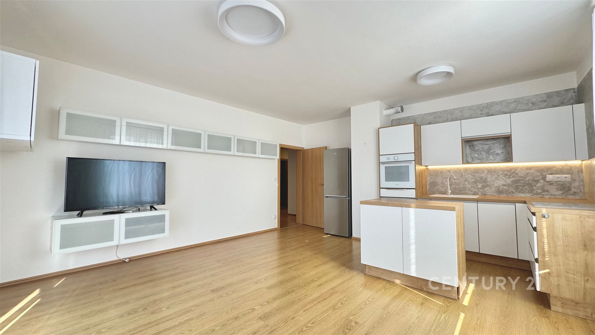 Dispoziční řešení bytu: vstupní předsíň, komora, koupelna s vanou, samostatné WC s umyvadlem, obývací pokoj propojený s kuchyňským koutem a vstupem na balkon, a dále 2 samostatné pokoje. Balkon se západní orientací má plochu 6,1 m2. Kuchyňská linka je vybavena bílou indukční deskou, myčkou nádobí, elektrickou troubou a volně stojící lednicí s mrazákem. V jednom z pokojů je k dispozici velká šatní skříň.