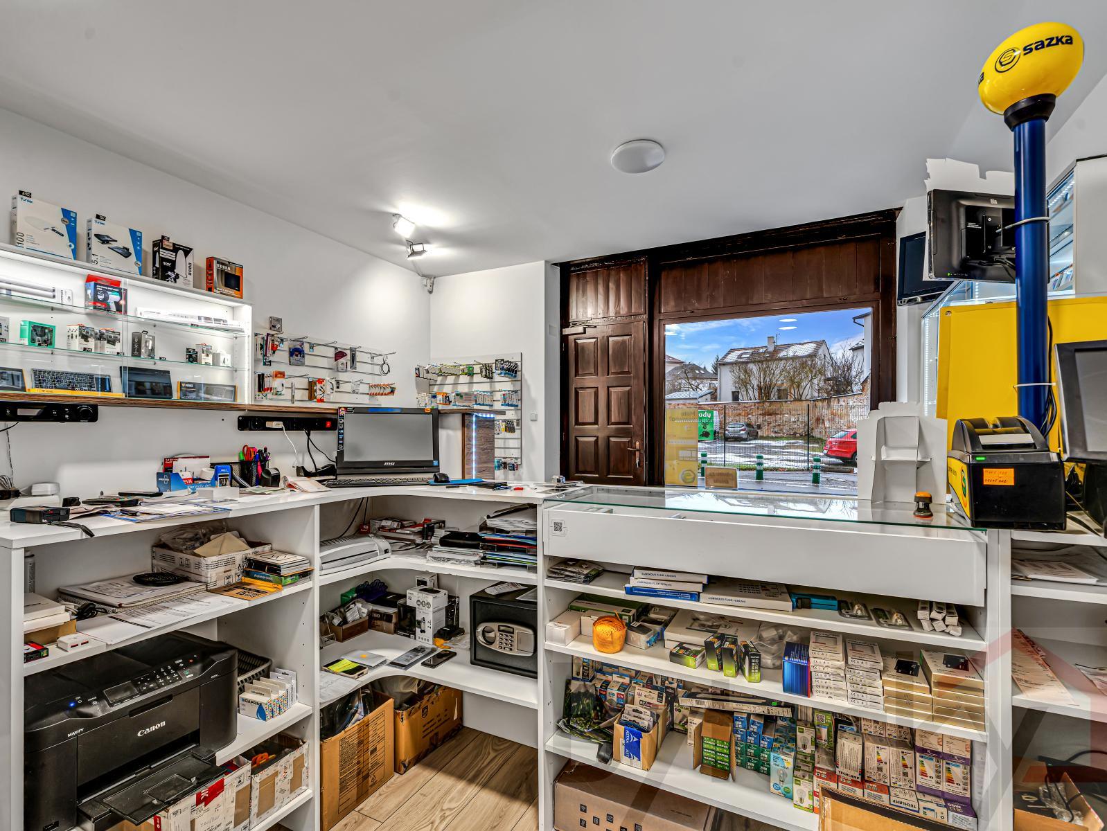 Obchodní část o velikosti 40,7 m zahrnuje prodejnu 28,9 m2, kancelář/dílnu 8,83 m2 a zázemí s kuchyňkou a WC 2,97 m2. V současnosti je prostor využíván jako prodejna a servis mobilních telefonů. Na obchodní část navazuje bytová jednotka o velikosti 55,68 m, která nabízí ložnici 7,46 m2, chodbu 5,78 m2, předsíň 8,75 m2, koupelnu se sprchovým koutem 4,69 m2 a prostorný obývací pokoj s kuchyňským koutem 29 m2. Součástí bytu je také vestavěné patro na spaní, šatní skříň na míru a vstup na společný dvůr, který lze využívat jako terasu.
