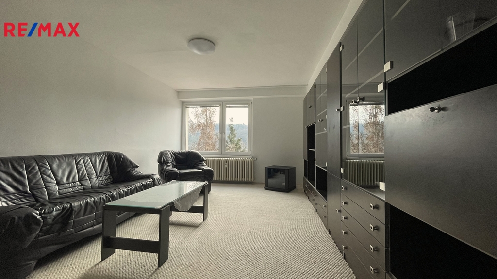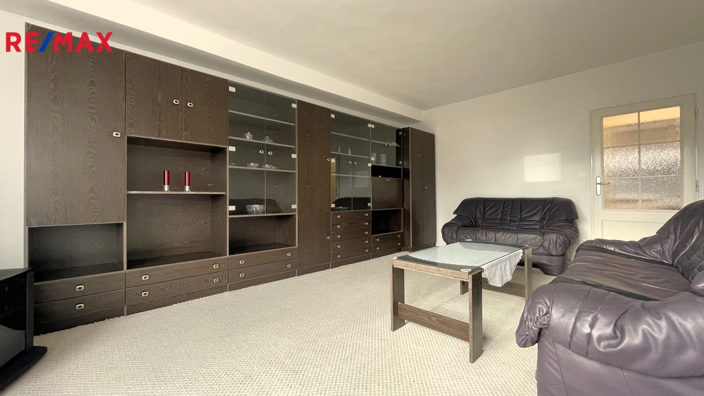 - obývací pokoj: koberec, sedací souprava se 2 křesly, konferenční stolek, obývací nábytková stěna, okno na jih opatřené žaluziemi
