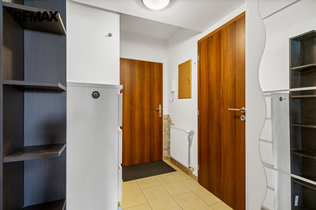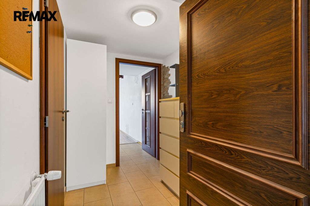 Ze vstupní chodby bytu je přímý vstup do obývacího pokoje s kuchyňským koutem. Kuchyňská linka je plně vybavená vestavěnými spotřebiči značky Whirlpool – vestavěná lednice, myčka na nádobí, elektrická varná deska, kombinovaná elektrická & mikrovlnná trouba a digestoř. Ve vstupní chodbě je šatní skříň, komoda a botník. Ze vstupní chodby je vchod do koupelny, kde je sprchový kout, WC, umyvadlo a plynový kotel. Z obývacího pokoje vedou schody do horního patra, kde je menší ložnice a úložné prostory.