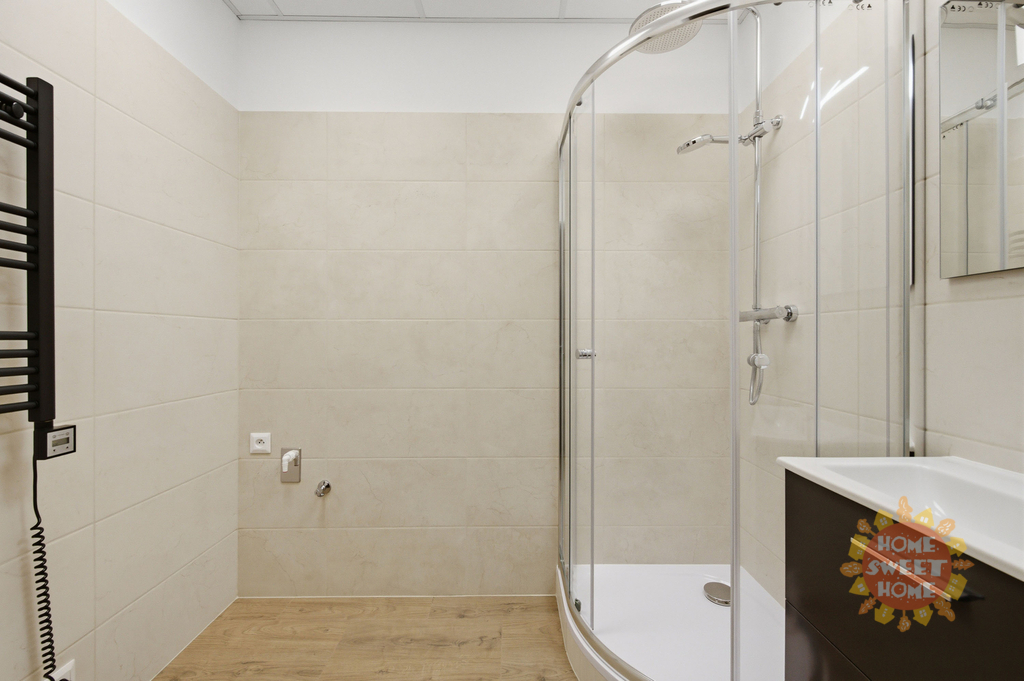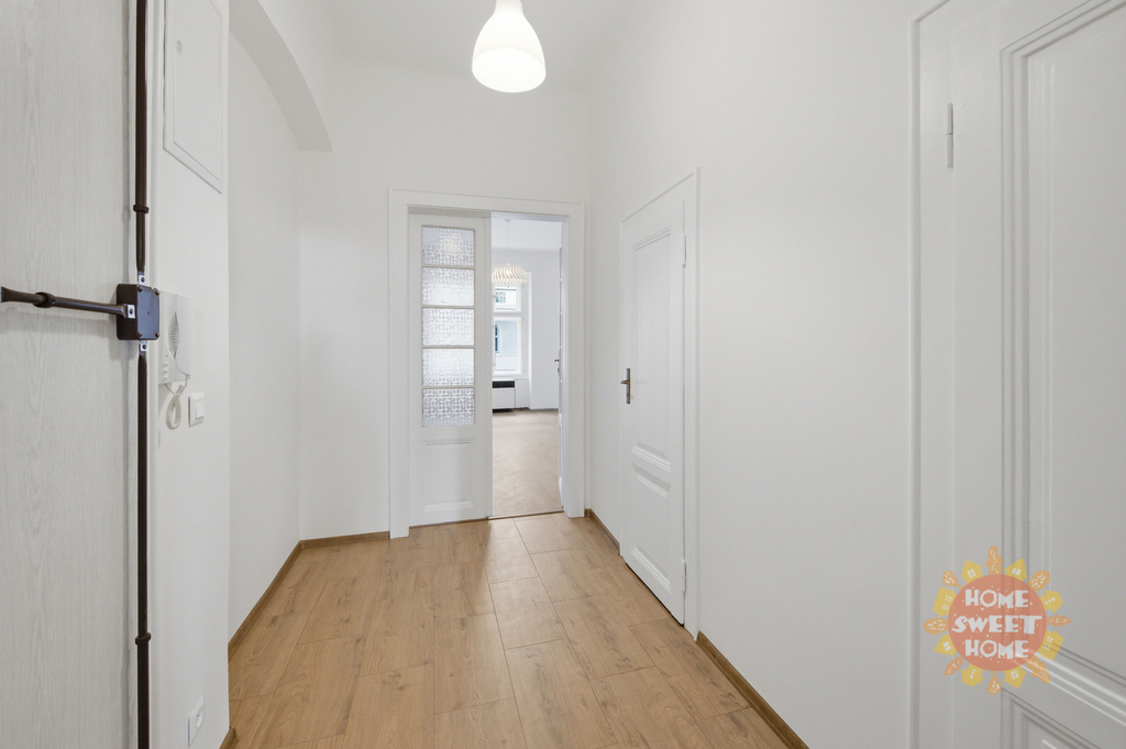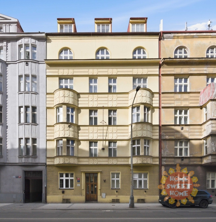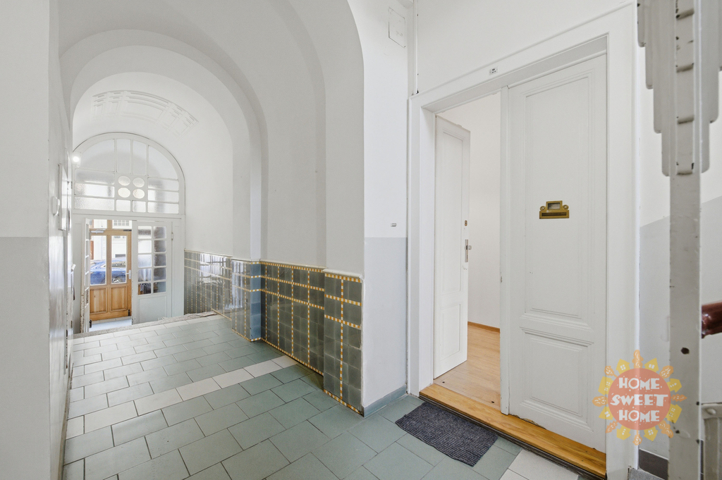 Byt je situován ve 1. patře (zvýšené přízemí) udržovaného cihlového domu s výtahem. Jeden pokoj je orientovaný do ulice a pokoj s kuchyňskou linkou je orientovaný do klidného vnitrobloku. Dále byt sestává z modernizované koupelny se sprchovým koutem a toalety.