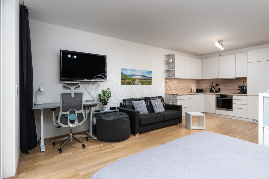 Pronájem prostorného bytu 1+kk s terasou, sklepem a garážovým stáním – Praha 4, Braník, Skálové