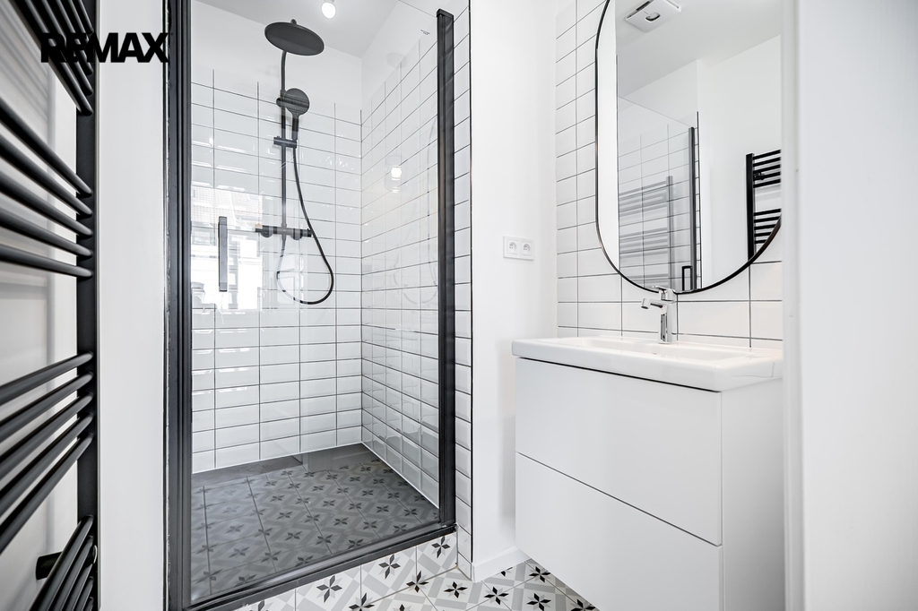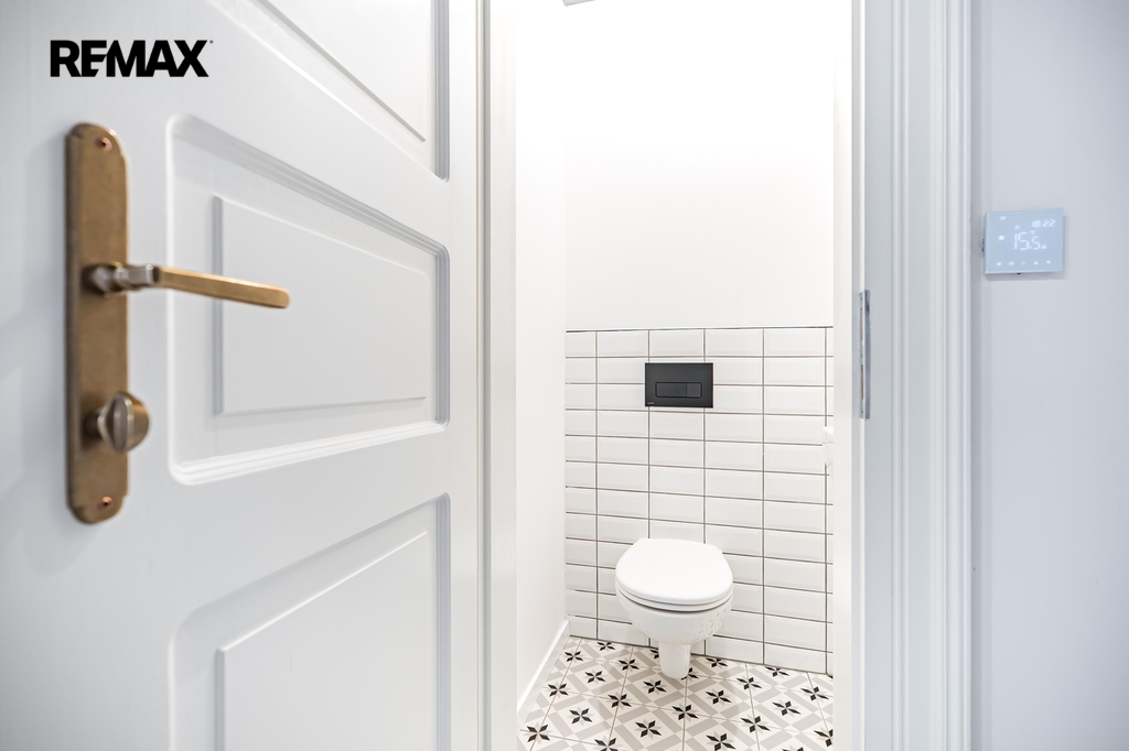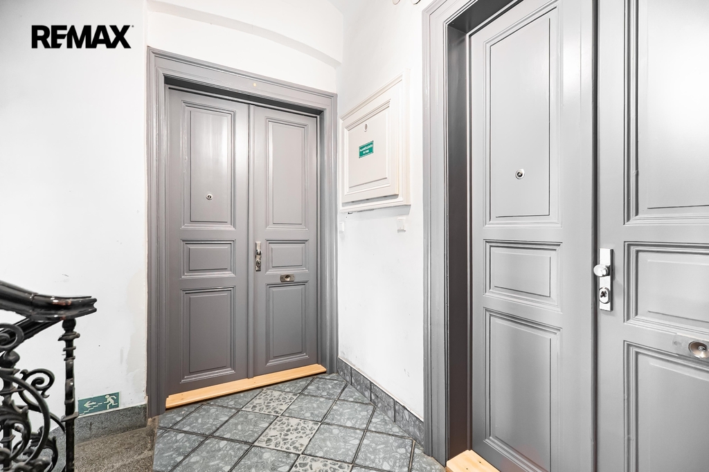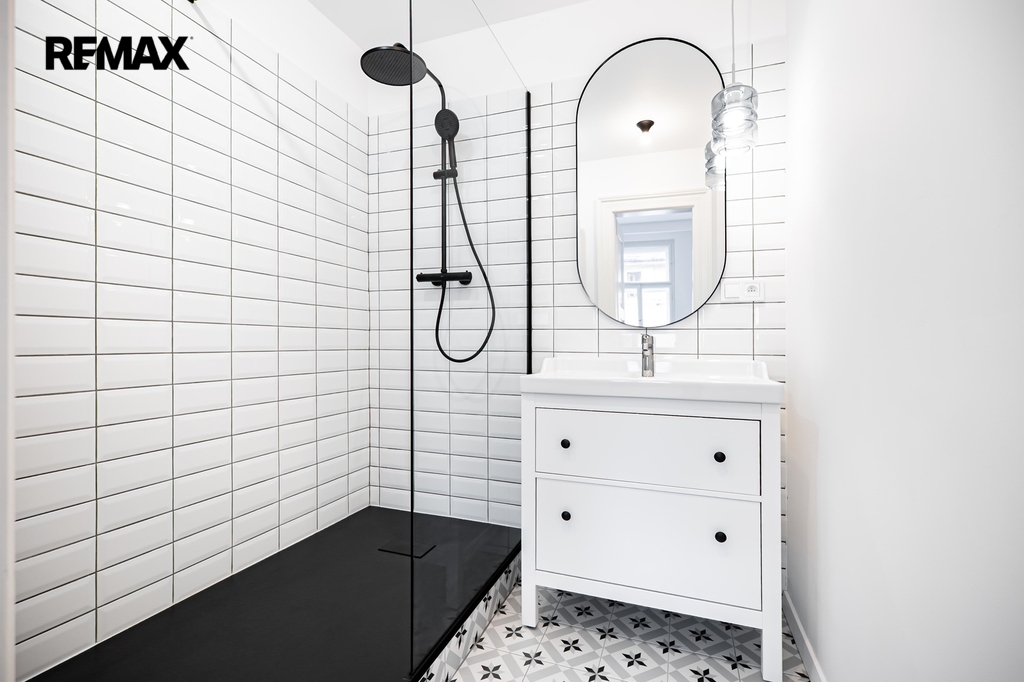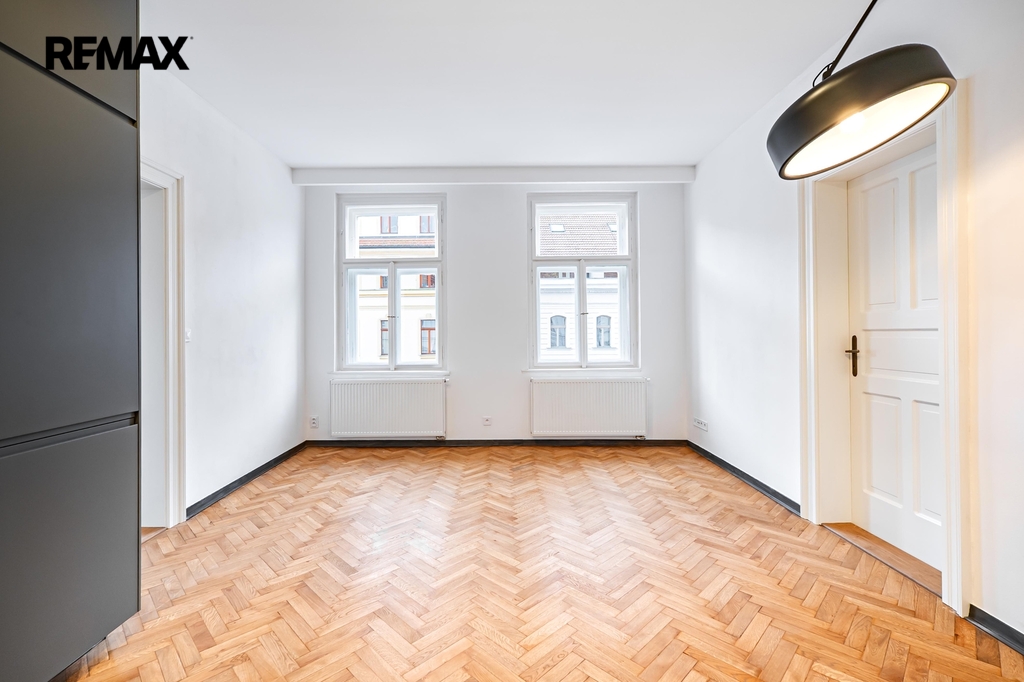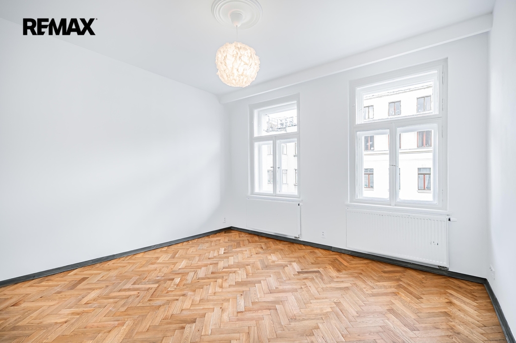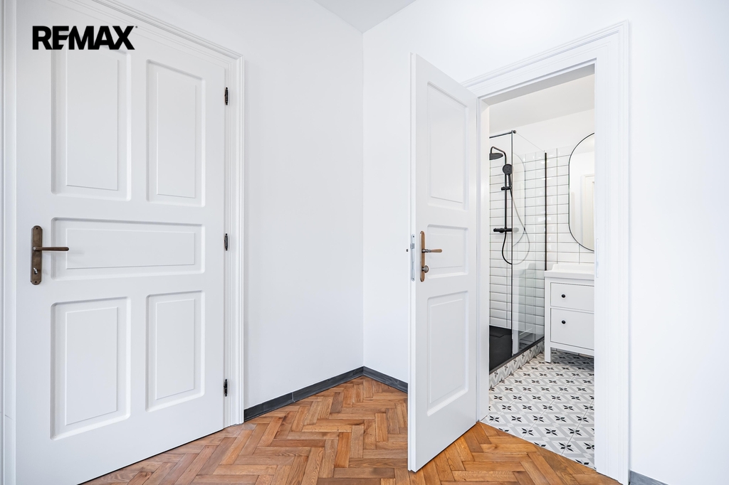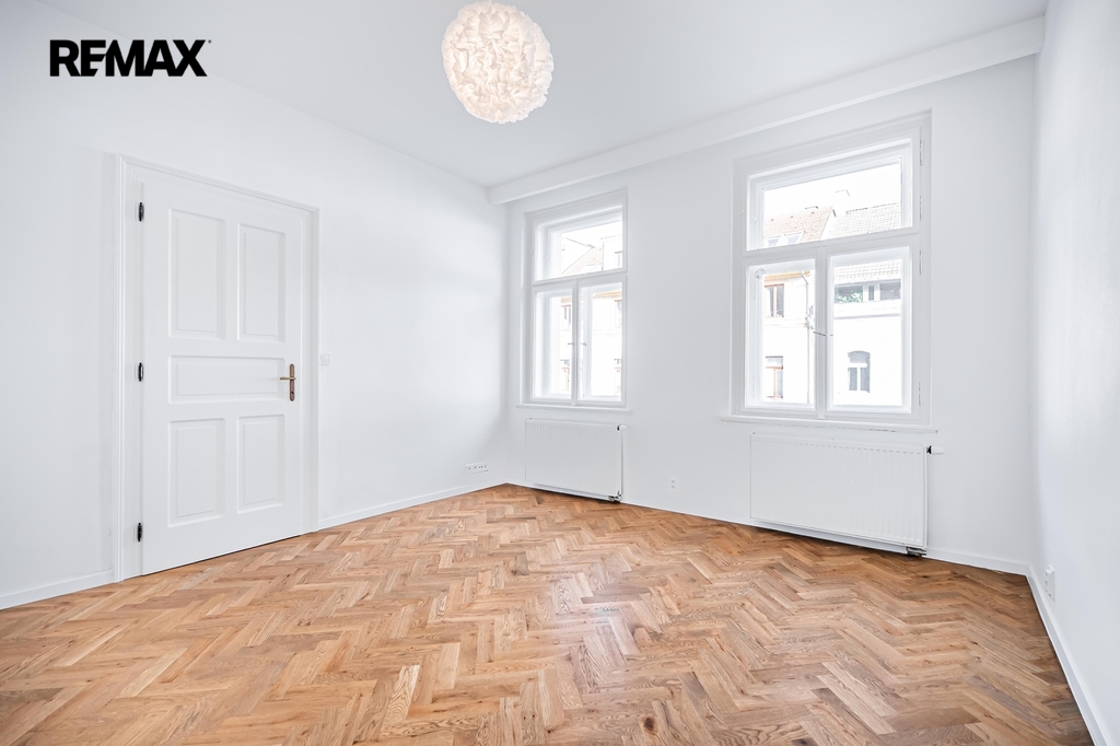 Útulný a světlý byt prošel nákladnou rekonstrukcí. Disponuje vstupní předsíní, prostorným obývacím pokojem s kuchyňskou linkou a dvěma pokoji, každý z nich má přitom svou vlastní koupelnou se sprchovým koutem. Kuchyně ve tvaru L je zařízena lednicí s mrazákem, indukční varnou deskou, elektrickým sporákem a myčkou, najdete v ní i prostor pro pračku. Na podlaze bytu jsou položeny renovované dřevěné parkety, vkusné vybavení a doplňky podtrhují stylový ráz bytu. Velkou výhodou je možnost parkování vozu ve dvoře domu (cena parkovacího stání činí 5.000,- Kč/1 vůz měsíčně).