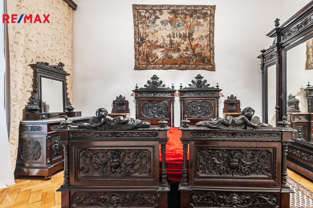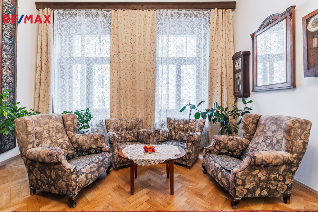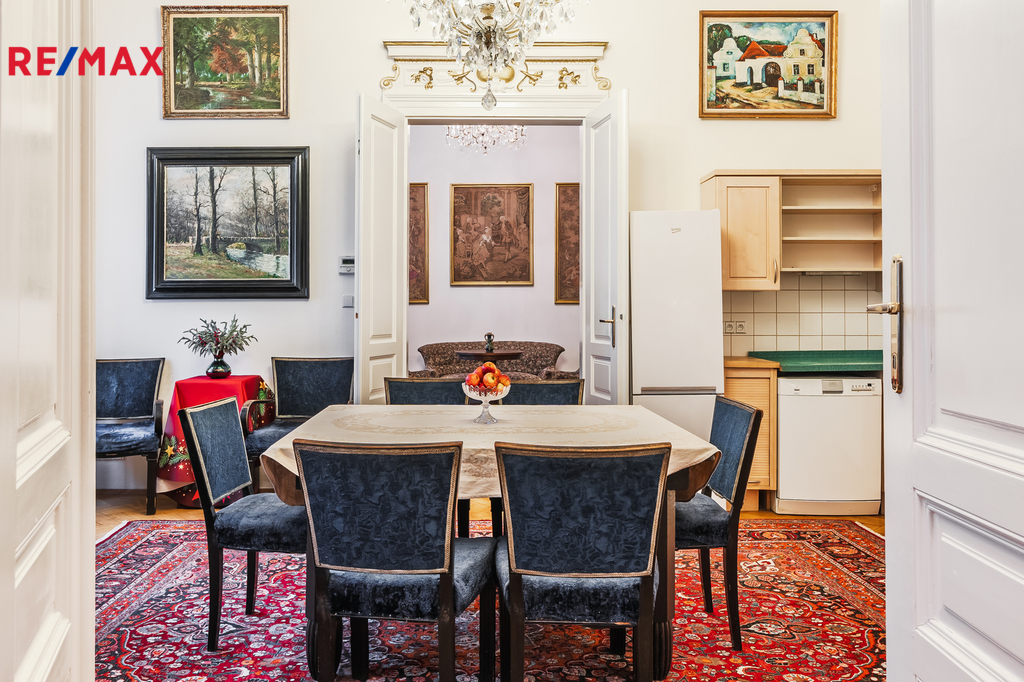 Interiér bytu je vybaven vkusným historickým nábytkem, který vytváří jedinečnou atmosféru a styl připomínající šlechtické městské rezidence. Velkorysá dispozice nabízí samostatné vstupy do všech místností z prostorné centrální chodby, což zajišťuje pohodlí a soukromí pro vícečlennou domácnost, případně i kombinaci bydlení a reprezentativního zázemí.