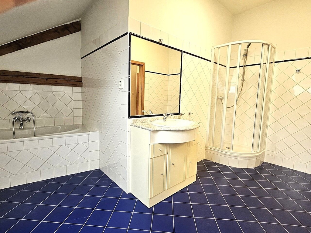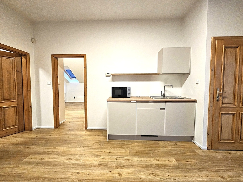 Prostor sestává ze vstupního schodiště (8,21 m2), 4 průchozích místností (22,51 m2, 16,77 m2, 9,07 m2, 13,23 m2), koupelny s WC (7,92 m2) a 1 neprůchozí místnosti, ve které je i klimatizační jednotka (26,28 m2). Prostor je nezařízený nábytkem. K dispozici je nová kuchyňská linka s novými spotřebiči – indukční vařič, lednice a mikrovlnná trouba. V prostorné koupelně je umývadlo, WC, vana i sprchový kout. Topení je ústřední - společný kotel pro celý dům, který se ovládá samostatným termostatem nainstalovaným v prostoru. Prostor je možné mít zabezpečený alarmem od společnosti Jablotron, který je napojený na CPO a to za 400 Kč měsíčně. Parkování je možné pro 2 auta na přilehlém pozemku před domem za 1.450 Kč měsíčně / 1 auto.
