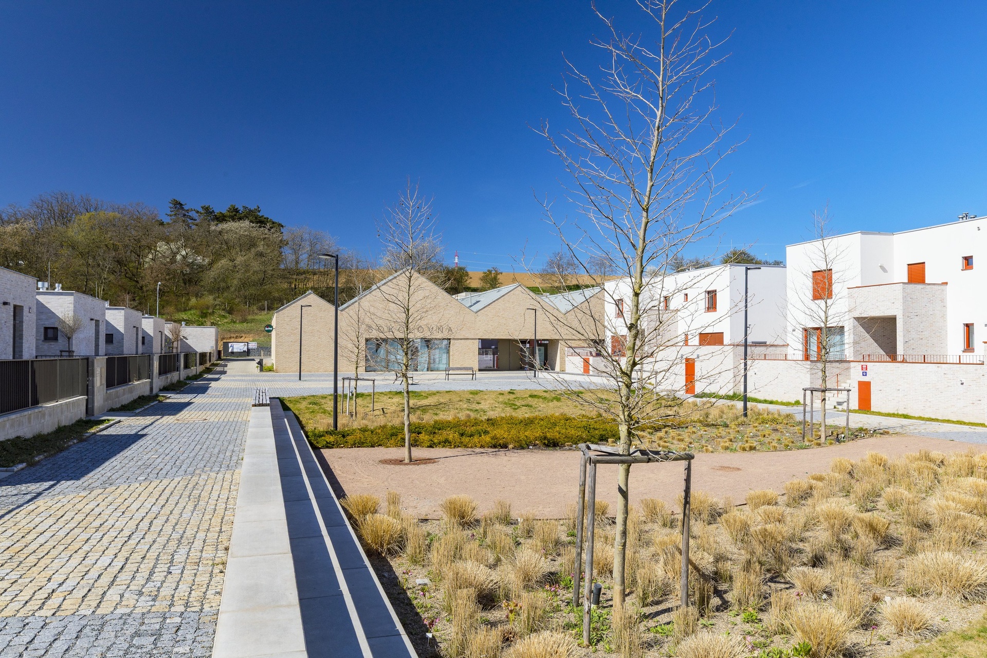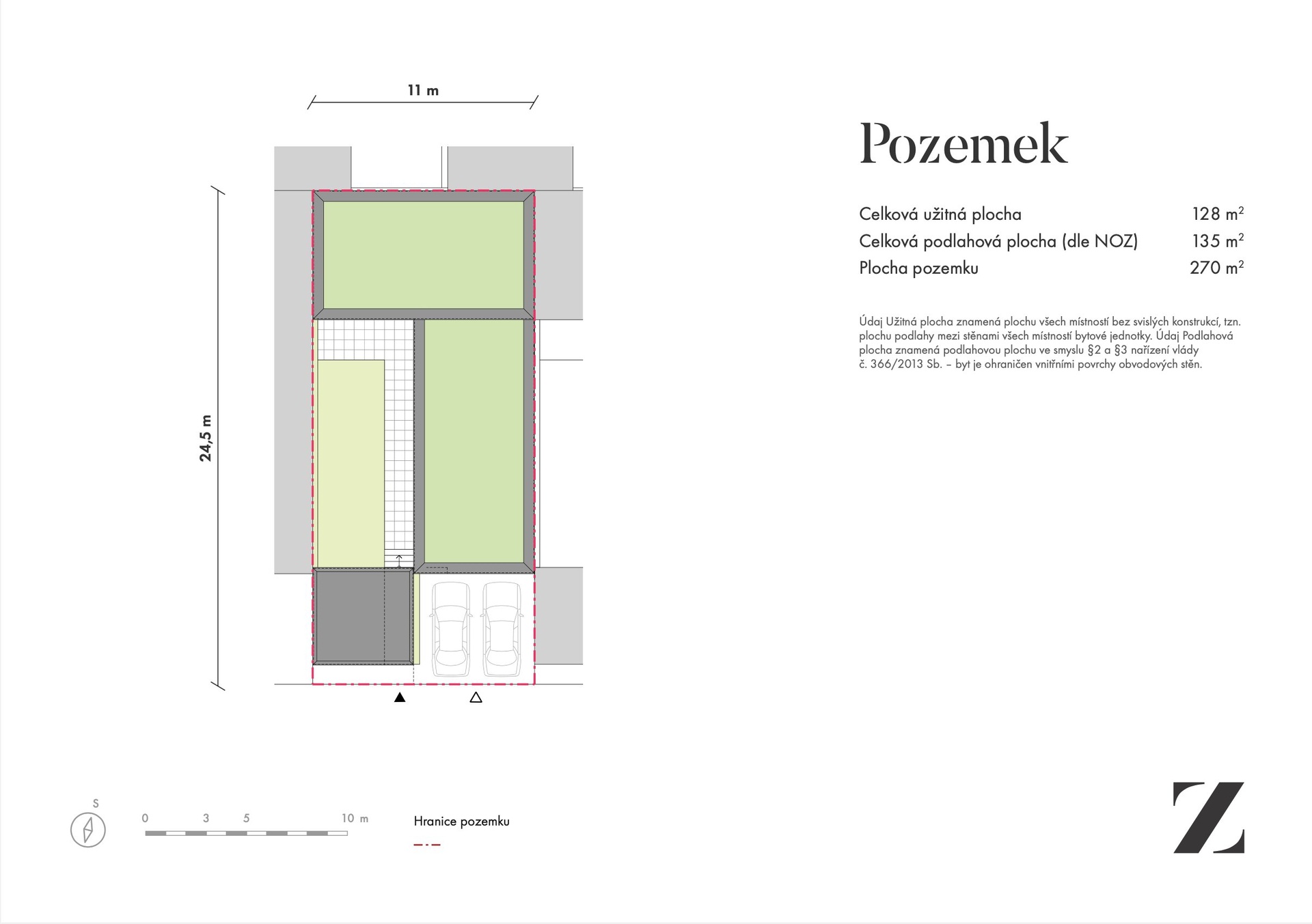 Nový jednopodlažní dům o dispozici 4+kk (127 m²) + 56 m² terasa + 11 m² venkovní sklad, vstupní portál 5 m² a dvě parkovací stání před domem.
