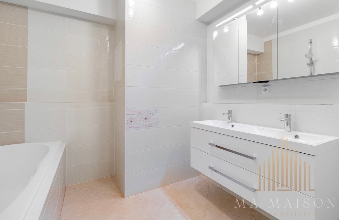 Místnosti jsou prostorné a velmi světlé. Součástí je vybavení - spotřebiče v kuchyňské lince (varná deska, trouba, digestoř, samostatně stojící lednice s mrazničkou, myčka, dále vestavěné šatní skříně v ložnici, v koupelně umyvadlová skříňka + zrcadlová skříňka nad umyvadlem a bytové osvětlení.