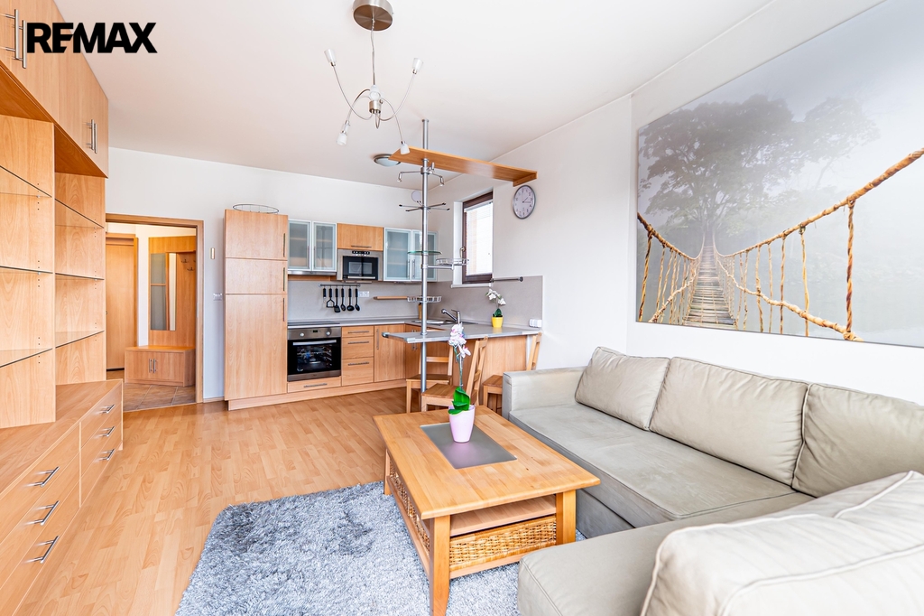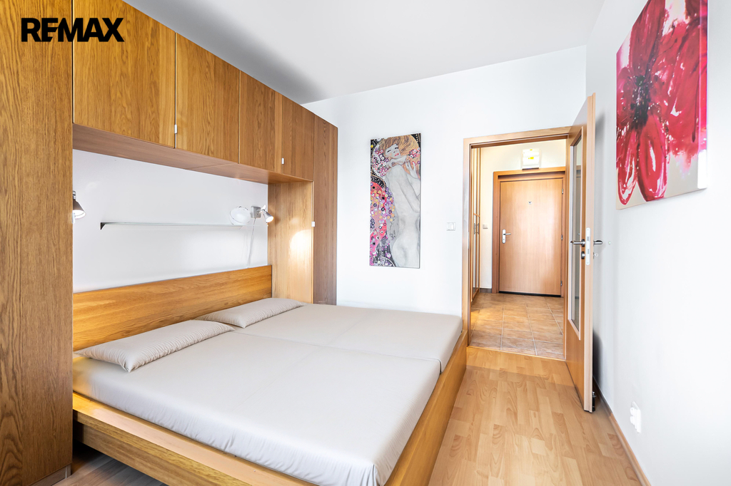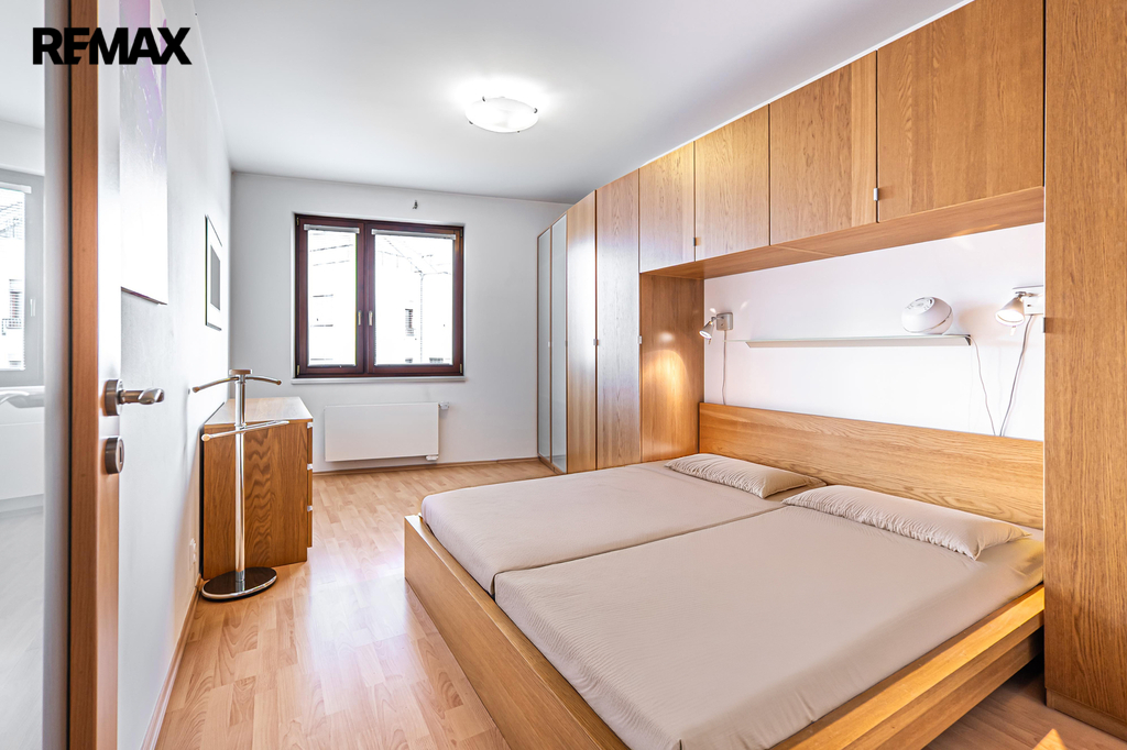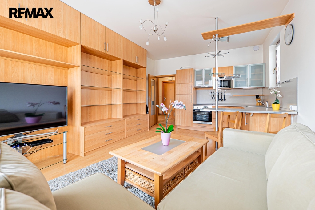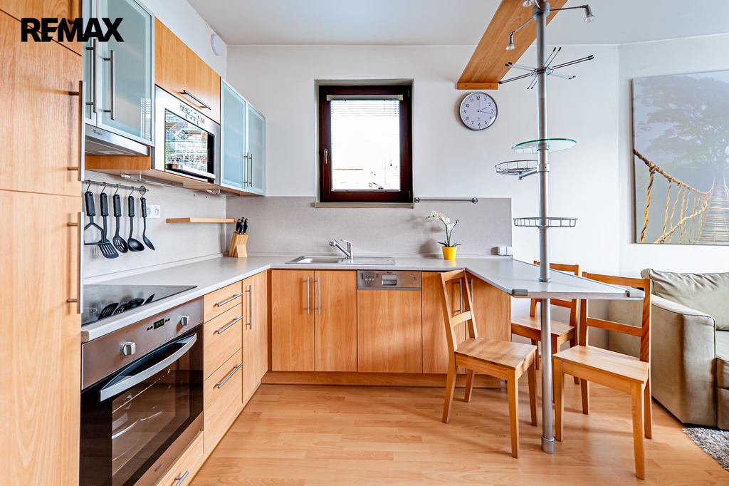 Jednotka se skládá z centrální vstupní předsíně s vestavěnou šatní skříní a botníkem. Na tu dále navazuje koupelna s vanou a pračkou, prostorná ložnice, obývací pokoj s kuchyňským koutem a v neposlední řadě samostatná toaleta. Ložnice je slunná a kromě manželské postele a komody nabízí dostatek úložných prostor v podobě skříní vyráběných na míru stylovému interiéru. Obývací pokoj je opatřen opět vestavbou s policemi, sedací soupravou ve tvaru L a francouzským oknem, kterým vstoupíte na příjemnou terasu s posezením. Součástí obývacího pokoje je kuchyňská linka s vestavěnými spotřebiči (lednice s mrazákem, elektrická trouba s varnou deskou, mikrovlnná trouba), se základní sadou kvalitního nádobí a barovým pultem. Na podlahách bytu je položena plovoucí podlaha, v předsíni a koupelně/toaletě pak praktická dlažba. Velkým bonusem je možnost pronájmu parkovacího stání v krytých garážích domu a sklepní kóje v jeho suterénu.