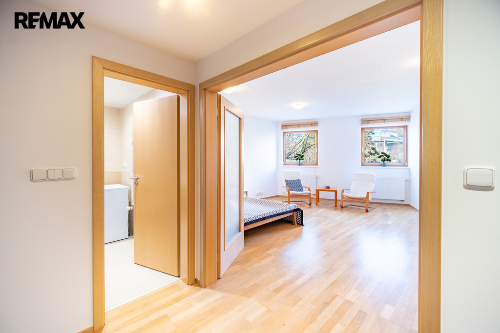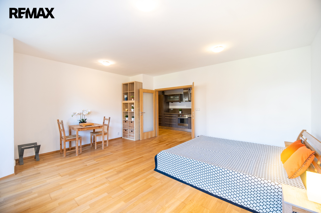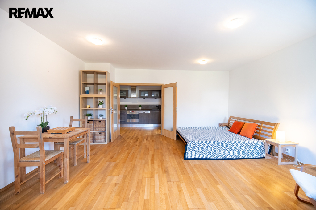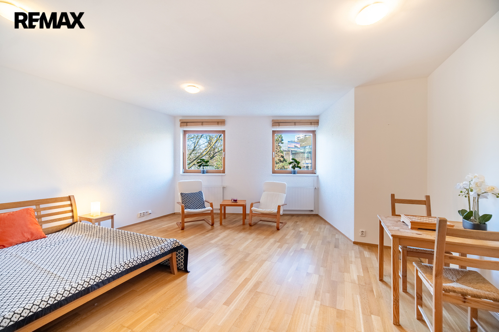 Dominantou tohoto bytu je krásný výhled do zeleně, který dodává bydlení klidnou a harmonickou atmosféru. Díky promyšlenému dispozičnímu řešení a kompletnímu vybavení nabízí byt maximální komfort jak pro jednotlivce, tak pro pár.