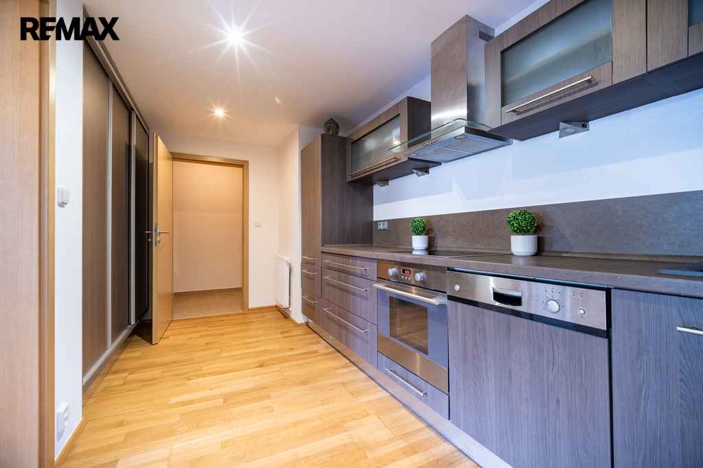 Kuchyň je vybavena vestavěnými spotřebiči a nabízí dostatek pracovní plochy pro pohodlné vaření. Praktické úložné prostory zajišťují vestavěné police a šatní skříň.