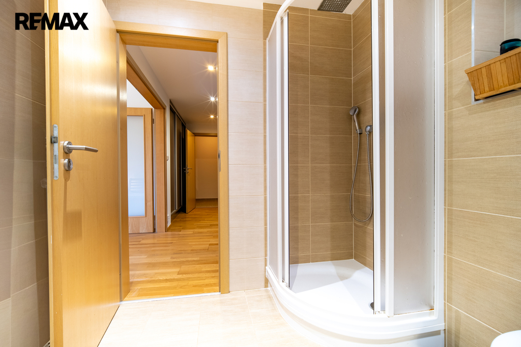 Koupelna je moderně řešena a disponuje sprchovým koutem, pračkou a toaletou.