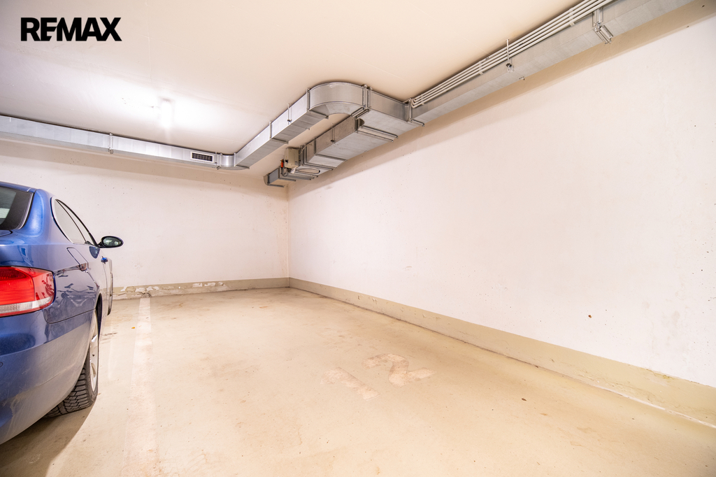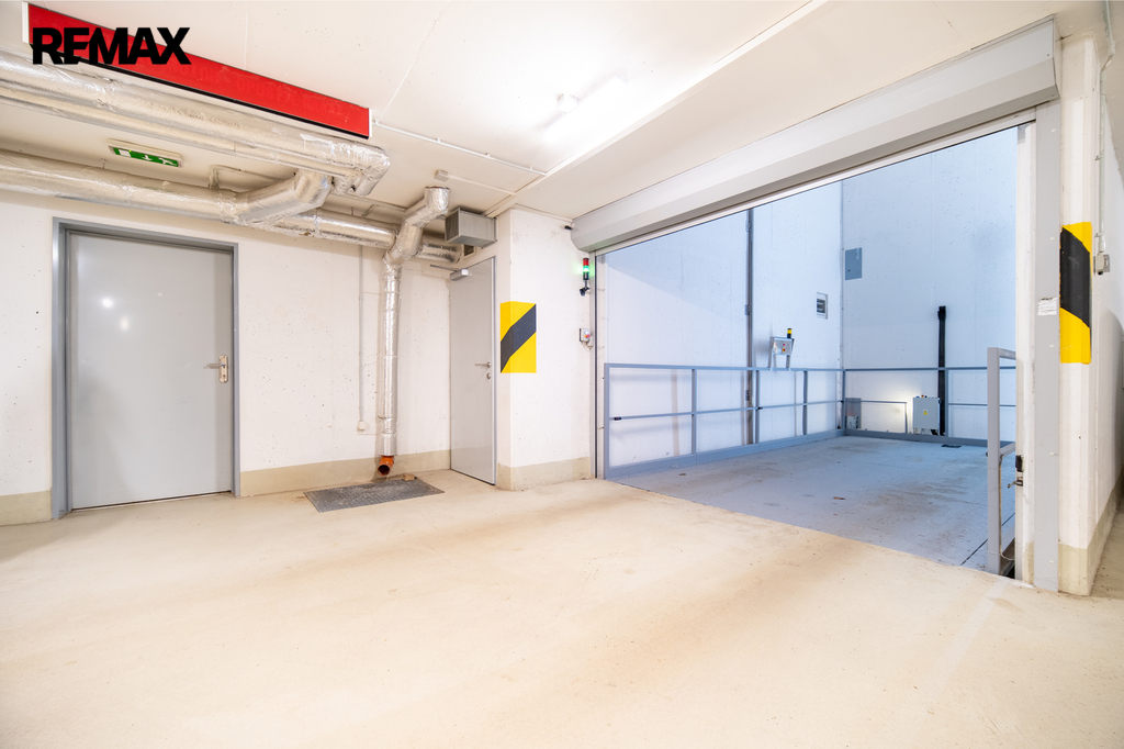K bytu náleží komfortní garážové stání (22 m²) v podzemní garáži domu. Vjezd je zajištěn přímo z ulice pomocí automobilového (posuvného) výtahu, kterým se pohodlně dostanete do garážového podlaží.