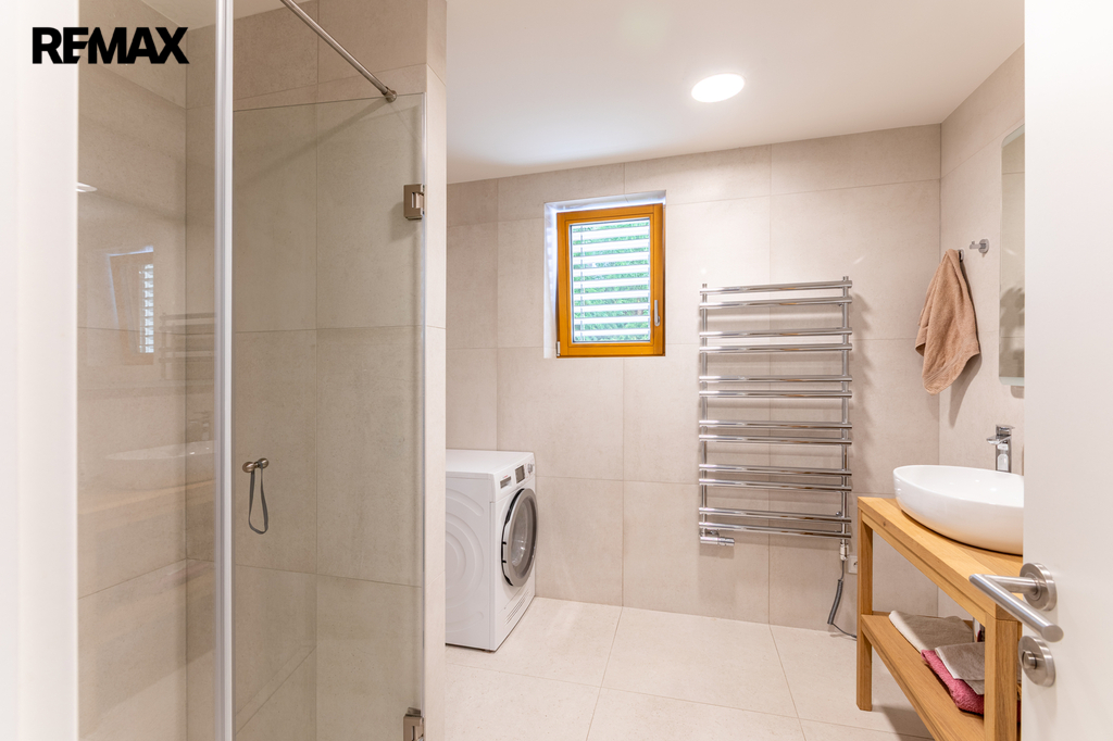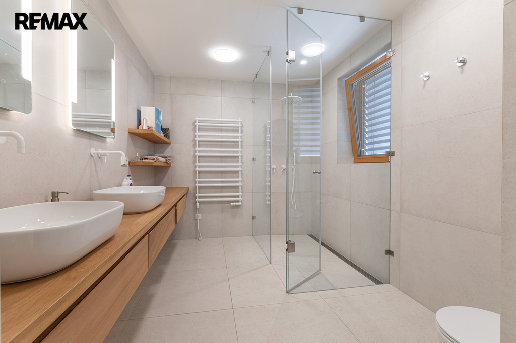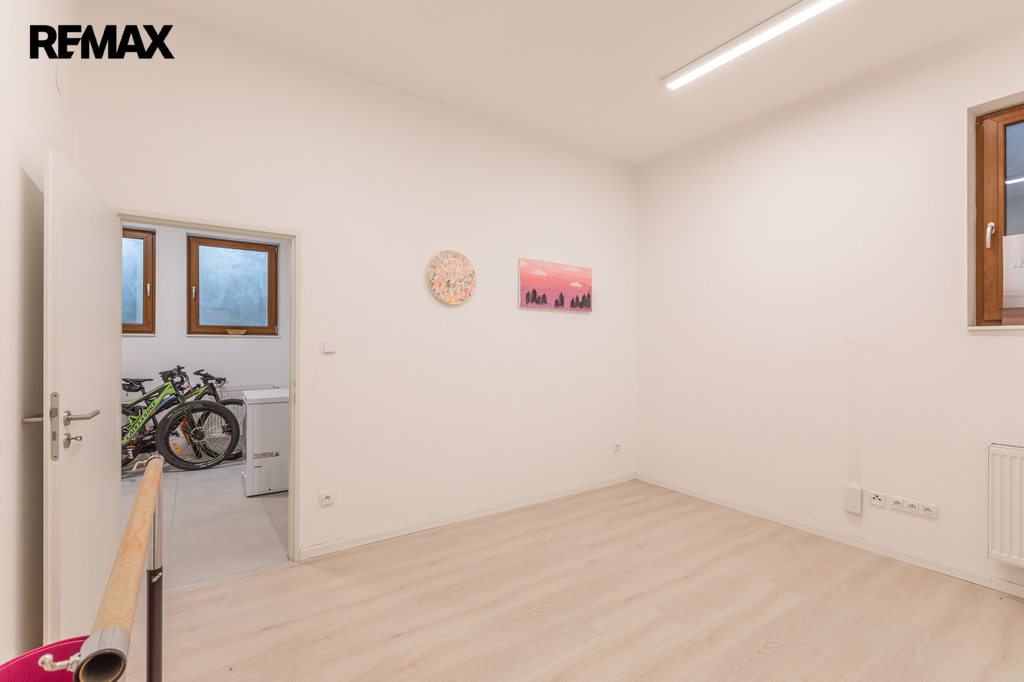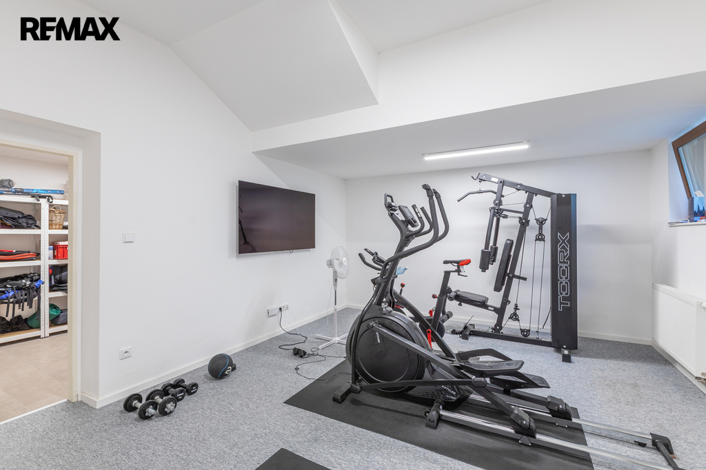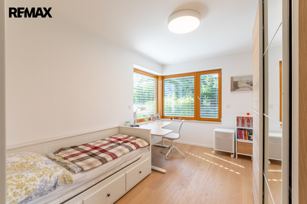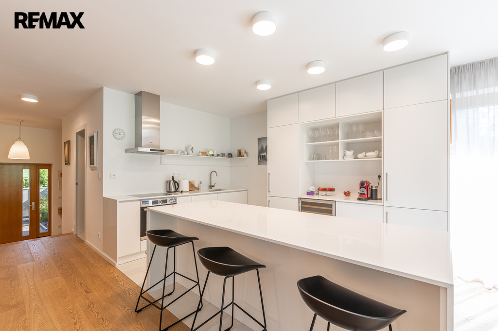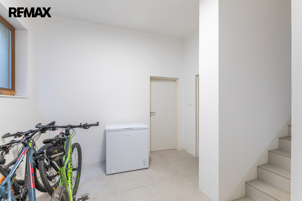 V přízemí se nachází prostorný obývací pokoj propojený s kuchyňským koutem a vstupem na zahradu, koupelna s toaletou. Dále dvojgaráž s možností nabíjení elektromobilu. Zahrada je osázena okrasnými i ovocnými dřevinami a disponuje vlastní studnou s rozvodem užitkové vody pro zavlažování. V prvním patře jsou čtyři ložnice a dvě koupelny s toaletou. Druhé patro nabízí samostatnou pracovnu (s možností využití jako druhá kuchyně), další ložnici, koupelnu s toaletou a prostornou terasu s výhledem do zeleně. Suterén domu je rozdělen do čtyř místností, které aktuálně slouží jako technická místnost, sklad a dvě domácí tělocvičny.