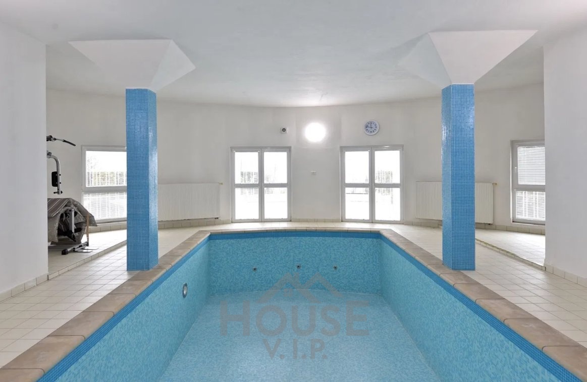 Zakrytý vnitřní bazén, sauna, sprcha, toaleta a technické zázemí. Přímý vstup na terasu a zahradu zajišťuje komfortní relaxaci nebo možnost pořádání firemních či společenských akcí.