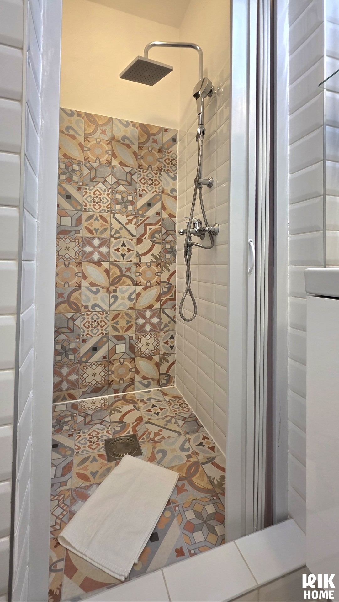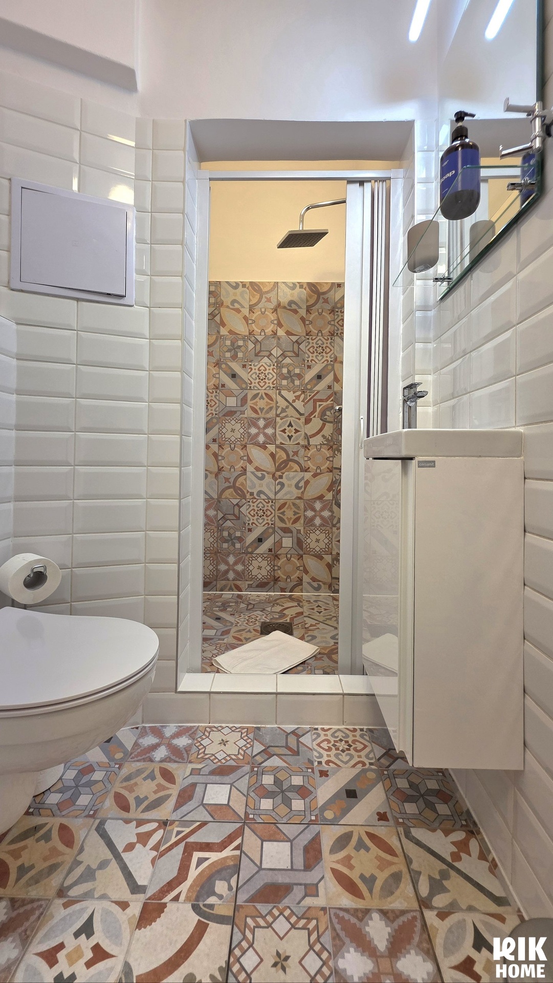 - Koupelna a WC: Koupelna se sprchovým koutem a toaletou, designové obklady.