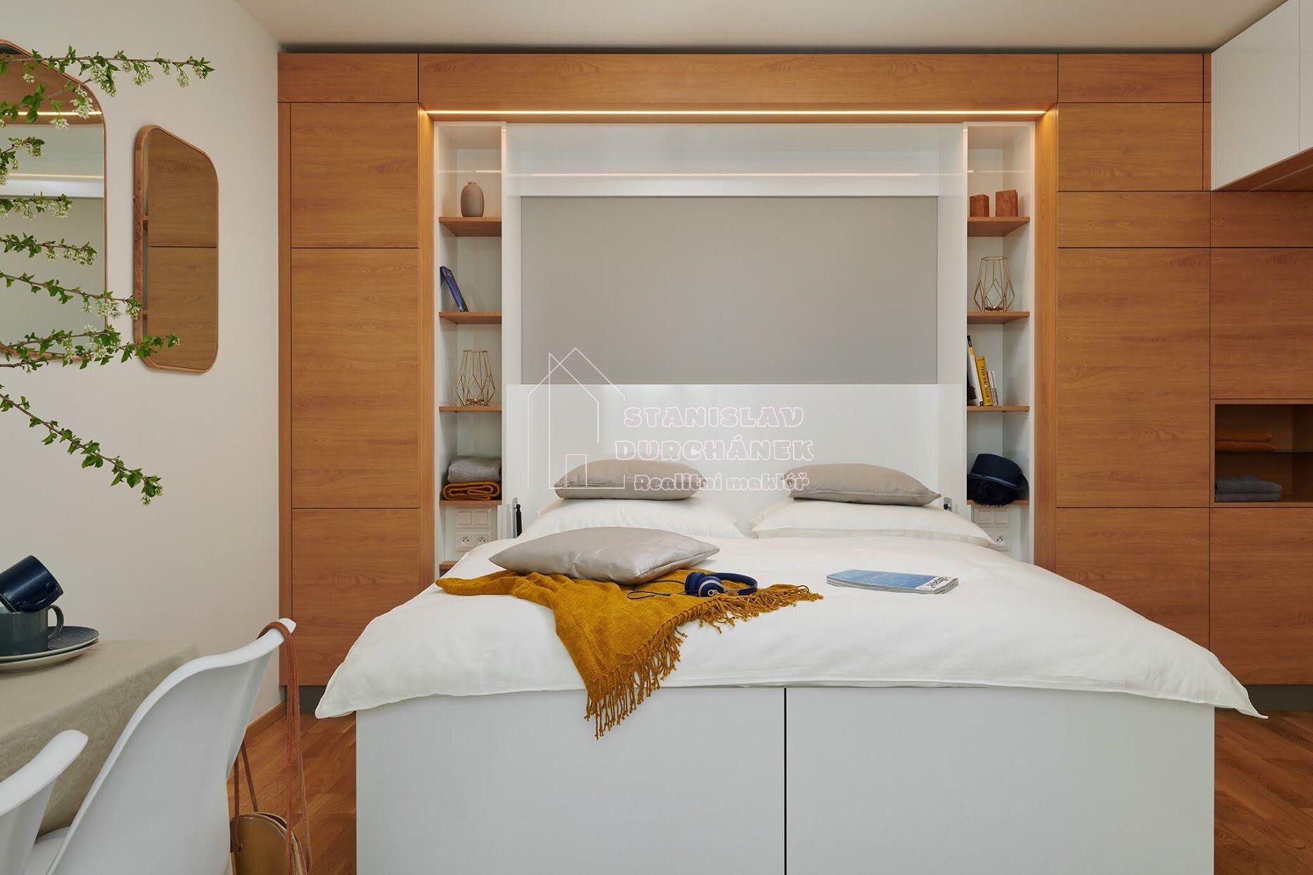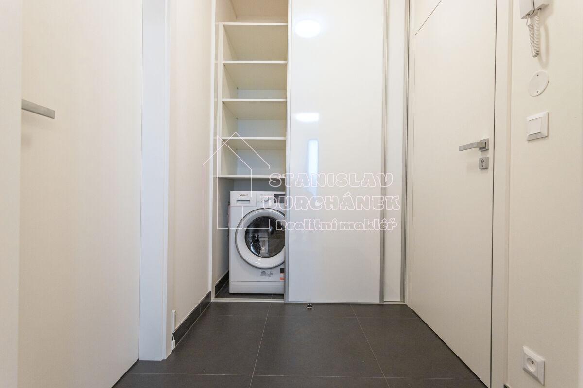 Byt bude pronajímán jako vybavený nábytkem i spotřebiči - velká skříňová stěna v obytném pokoji, pohovka s úložným prostorem, sklopná dvojpostel (200 x 180 cm) se zdravotní matrací, stůl, 2 židle, kuchyňská linka včetně vestavěných spotřebičů (lednička, mrazák, myčka, indukční varná deska, digestoř, mikrovlnná trouba s funkcí grilu). Ve vstupní chodbě je vestavěná skříň, ve které je umístěna i pračka se sušičkou (v jednom). Koupelna je se sprchovým koutem a WC.