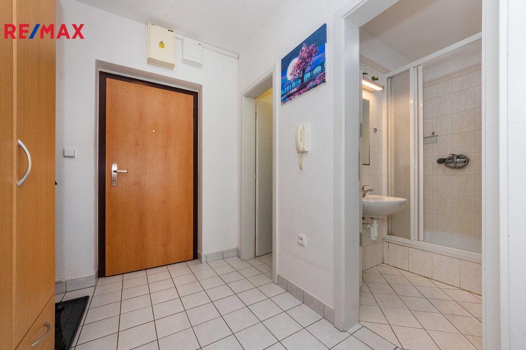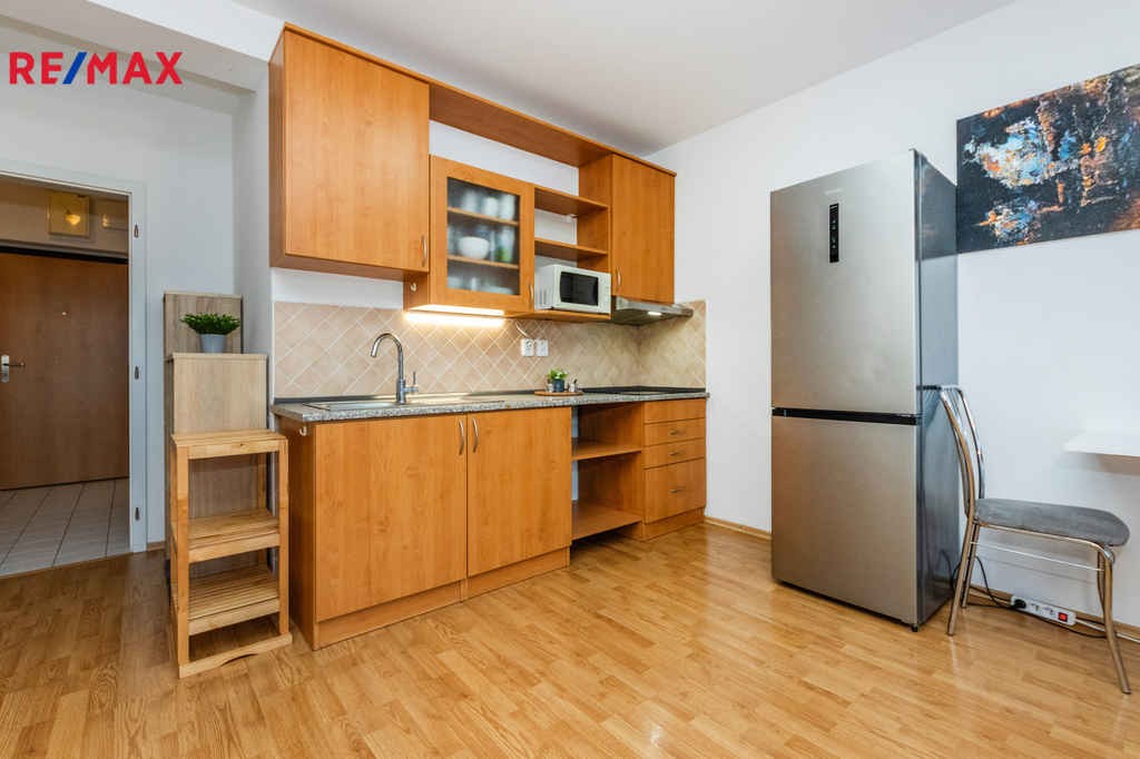 Byt je kompletně zařízen dle fotodokumentace a připraven k nastěhování. Dispozici tvoří prostorný a příjemně prosvětlený pokoj s kuchyňským koutem a jídelní zónou, odkud je přímý vstup na prostorný balkon 4,49m² s příjemným výhledem. K bytu dále náleží praktická komora, koupelna se sprchovým koutem a WC a chodba s vestavěnou skříní, která poskytuje dostatek úložného prostoru.