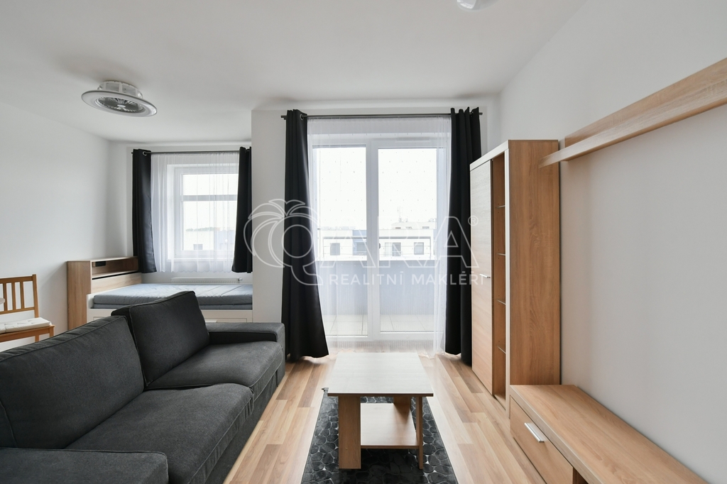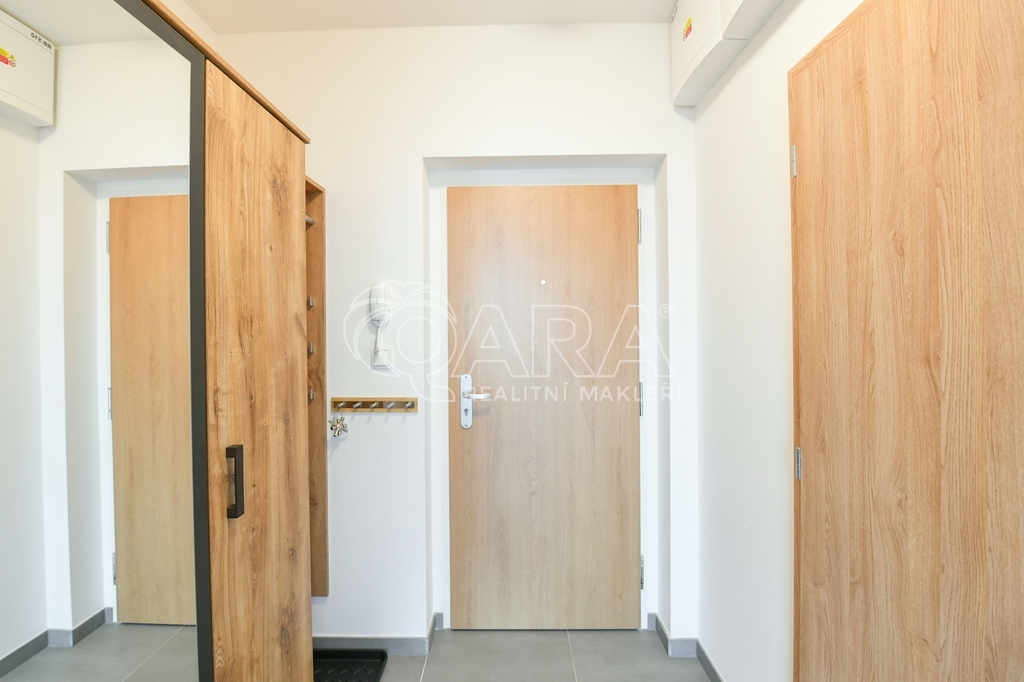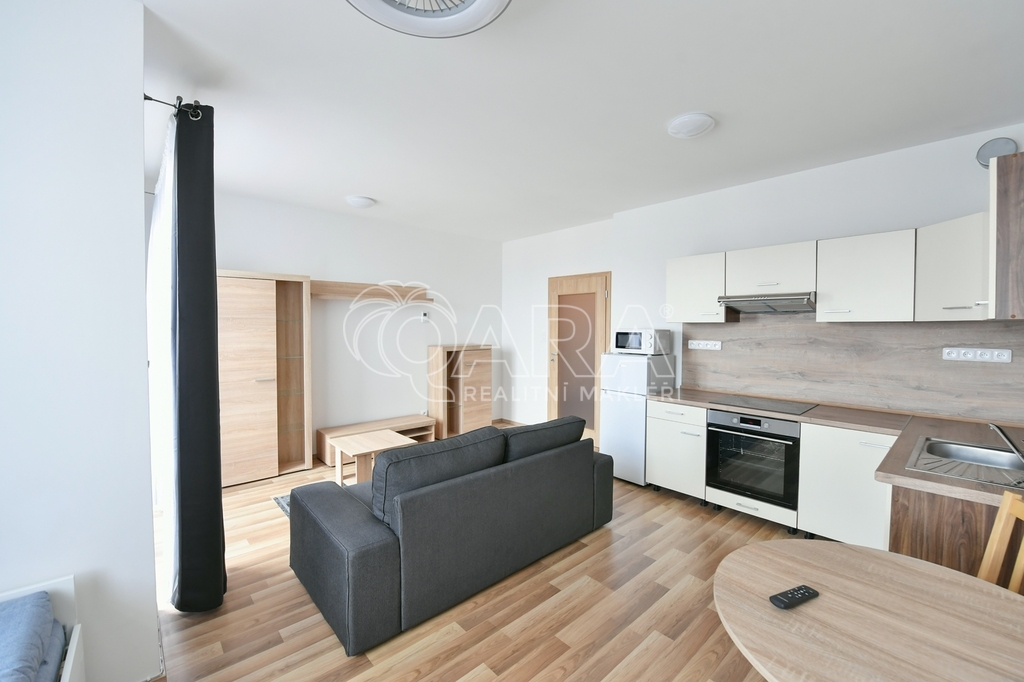 Byt o výměře 34,2 m2 (vnitřní plocha + sklep) s lodžií (2 m2) je umístěn v 5.NP novostavby bytového domu z roku 2020. Byt se pronajímá kompletně zařízen - vybaven kuchyňskou linkou s el. varnou deskou, troubou, lednicí, mikrovlnnou troubou. Dále je součástí pračka, jídelní stůl, 2x židle, sedací souprava, konferenční stolek, rozkládací postel a šatní skříň s věšákem v předsíni. Koupelna je společná s WC. V bytě je položena plovoucí podlaha, v koupelně a v chodbě je dlažba. Orientace oken na východ. K bytu patří sklepní kóje v suterénu domu a venkovní parkovací stání. Vytápění zajišťuje centrální plynová kotelna v domě. Nízké měsíční poplatky 2.650,- Kč + elektřina převodem. Kauce ve výši jednoho nájmu, provize ve výši jednoho nájmu. Kuřáci a domácí mazlíčci nejsou vítáni.