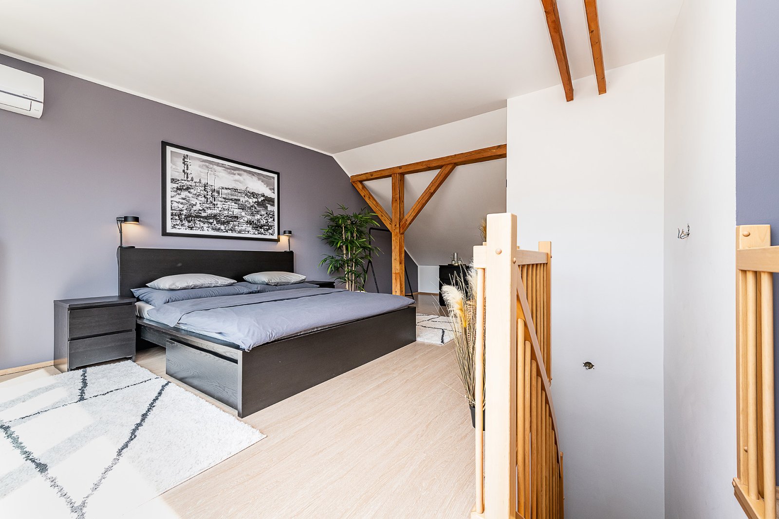 (V případě dlouhodobého pronájmu možno dohodnout prohození dispozice bytu, tedy ložnice ve spodním patře, a obývací pokoj v horním patře.)