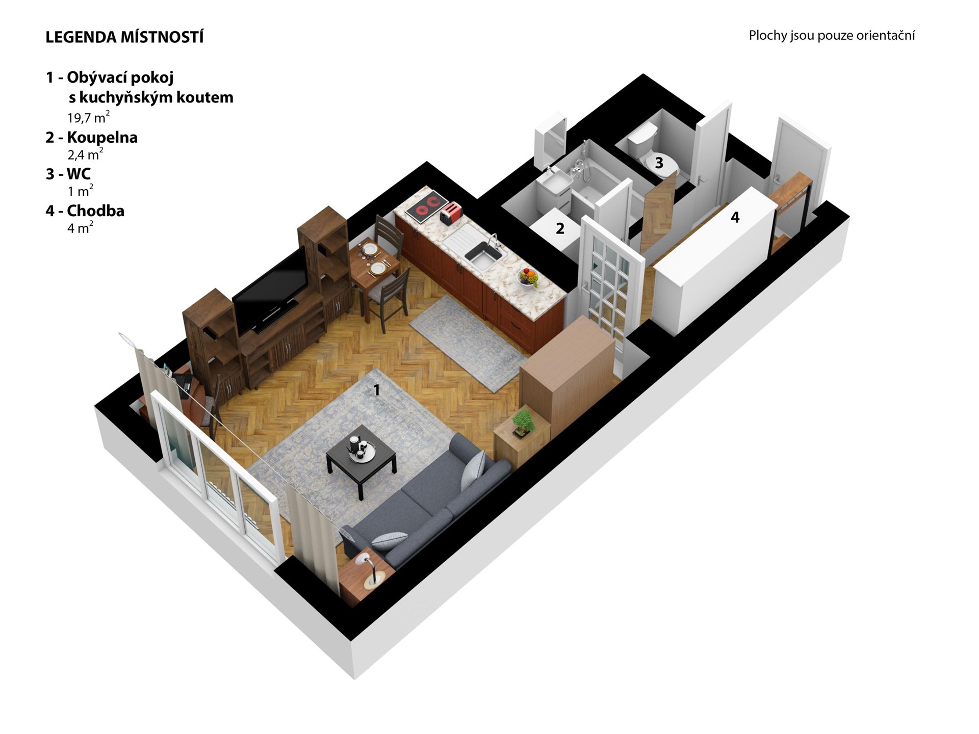| Dispozice/podlahová plocha: | 1+kk/30 m² |