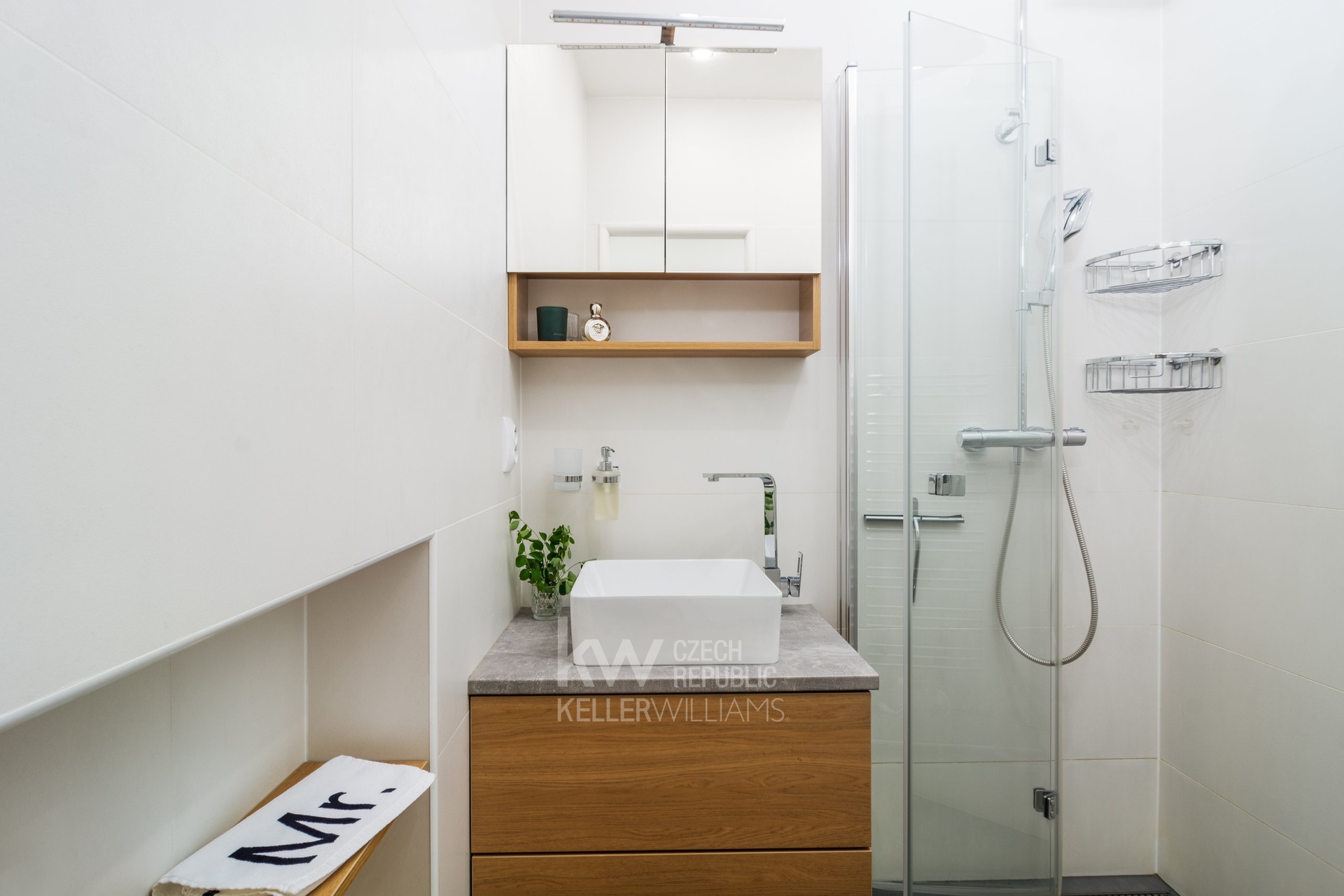 Kuchyně ve vysokém standardu je vybavena indukční deskou Siemens, troubou s mikrovlnkou Siemens, digestoří a dřezem Franke, pračkou se sušičkou Hoover, myčkou Siemens, ledničkou AEG a samostatnou kuchyňskou komodou. Z kuchyně je výhled do zeleně a přilehlé vilové čtvrti. Útulná koupelna se sprchovým koutem a elektrickým žebříkem na sušení ručníků. V bytě je samostatné WC. Teplo je zajištěno ústředním topením s kotelnou v domě, pro teplou vodu je v bytě nový 80l boiler. Nájemníci mohou též využívat sklep, kočárkárnu a sušárnu.