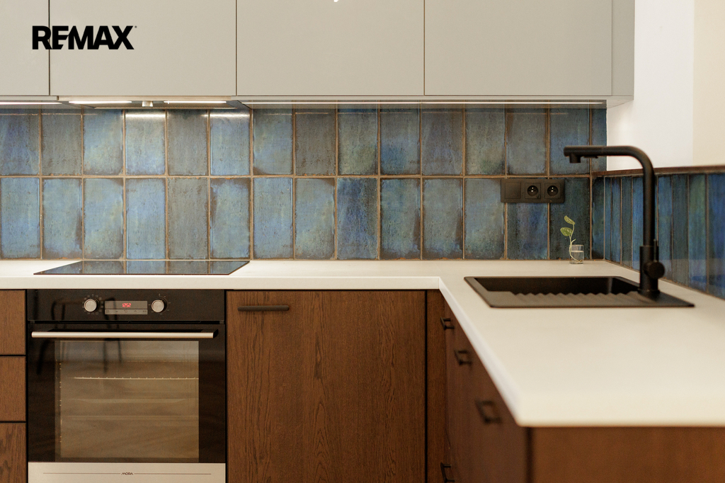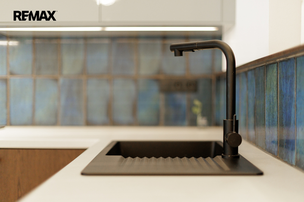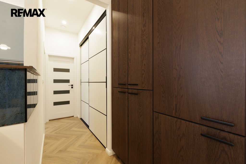 Byt je vybaven designovou kuchyní s myčkou nádobí, varnou deskou a troubou, doplněnou o kvalitní detaily včetně španělských obkladů. Součástí vybavení je také pračka, vestavěné skříně a velmi praktická šatna, která v bytech této kategorie bývá spíše výjimkou. V rámci rekonstrukce byl instalován také nový úsporný bojler na ohřev vody. Dispozice je navržena promyšleně a prostor využívá skutečně efektivně.
