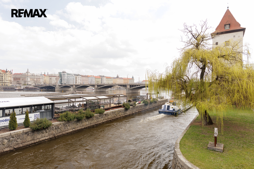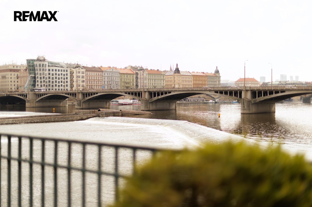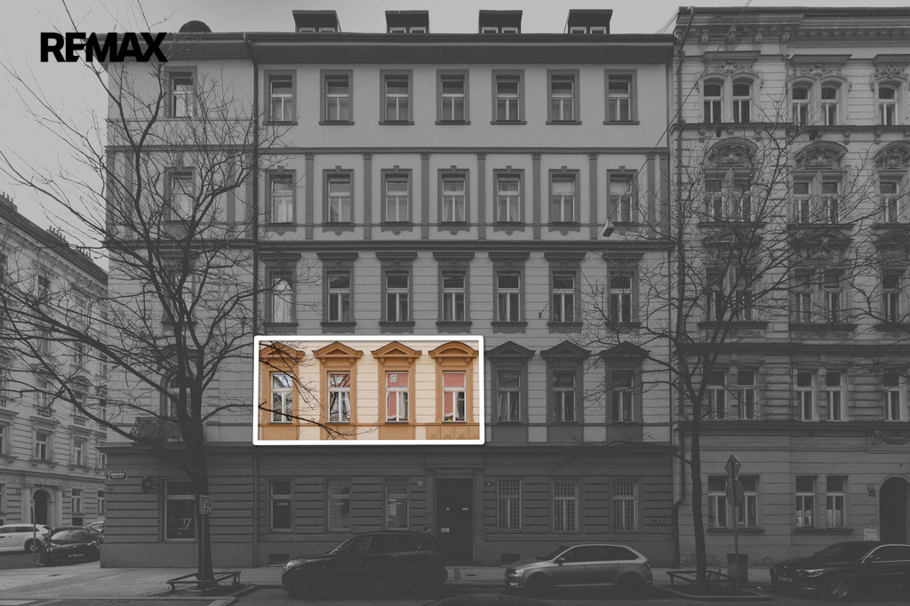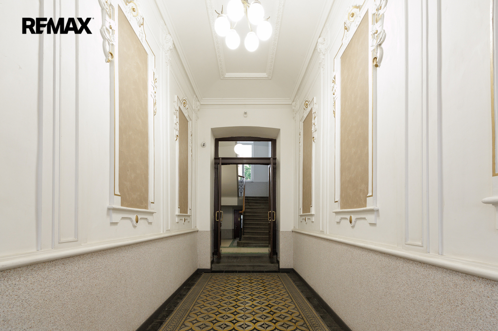 The apartment is situated on the second floor of a well-maintained historic 19th-century building on Zborovská Street in Smíchov, just moments from the Vltava riverbank and Janáčkovo nábřeží, with excellent public transport connections including metro, tram, bus.