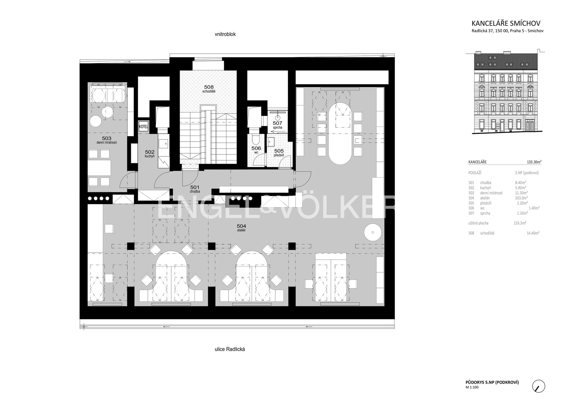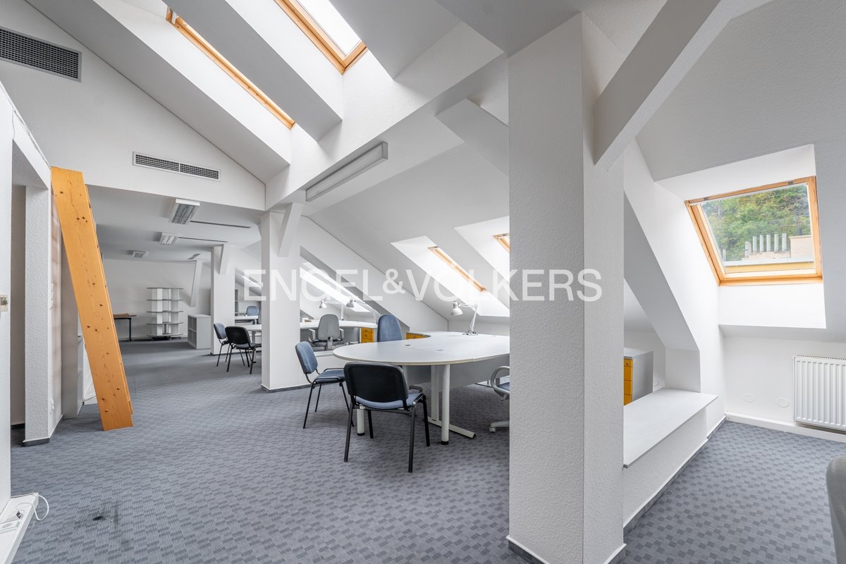 K dispozici je velkoprostorová kancelář, která disponuje velkým open space prostorem (103 m2), dále pak neprůchozí kanceláří, kuchyňkou a toaletami a sprchovým koutem.