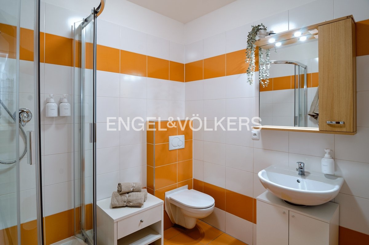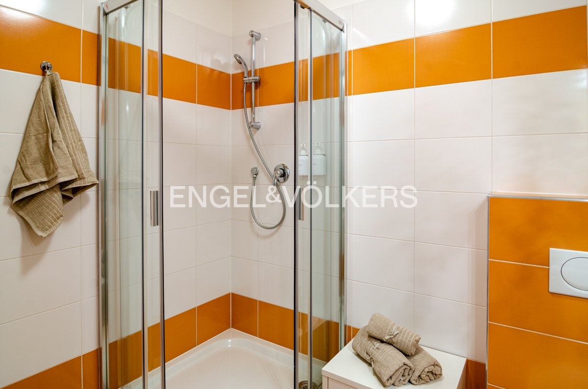 Koupelna je vybavená sprchovým koutem a nachází se zde přípojka na pračku. Celý byt působí moderně a nabízí příjemné a pohodlné bydlení.