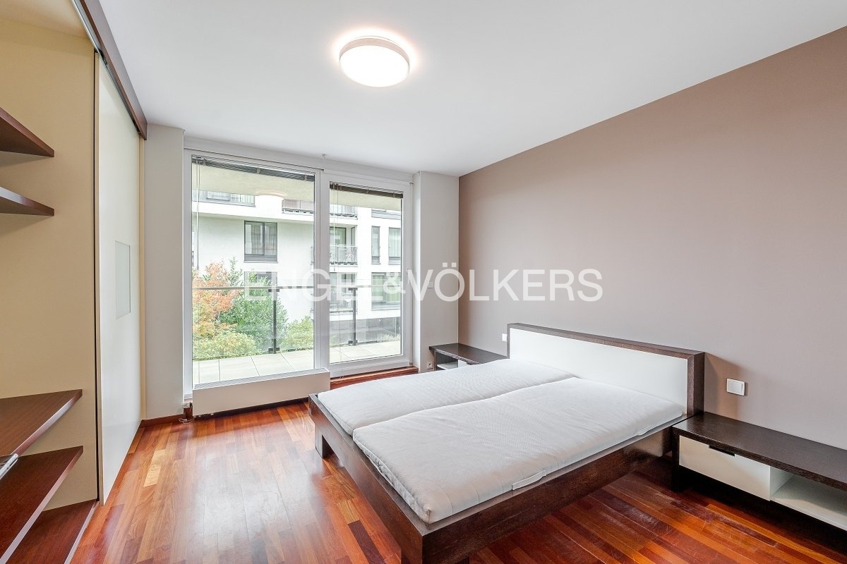 Byt se skládá ze vstupní chodby s vestavěnými skříněmi, třemi samostatnými ložnicemi a dvěma koupelnami. Srdcem bytu je obývací pokoj s plně vybavenou kuchyní a barovým pultem s krásnými výhledy na prahu a Pražský hrad. Předností bytu je pak prostorná terasa přístupná z obývacího pokoje a ložnice.