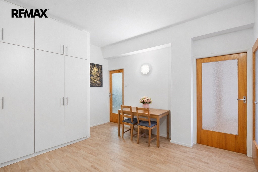 Jednou z hlavních předností bytu je velkorysé množství úložných prostor. Vestavěné skříně jsou chytře řešené a doplněné další skříní v chodbě, díky čemuž byt působí vzdušně a velmi funkčně.