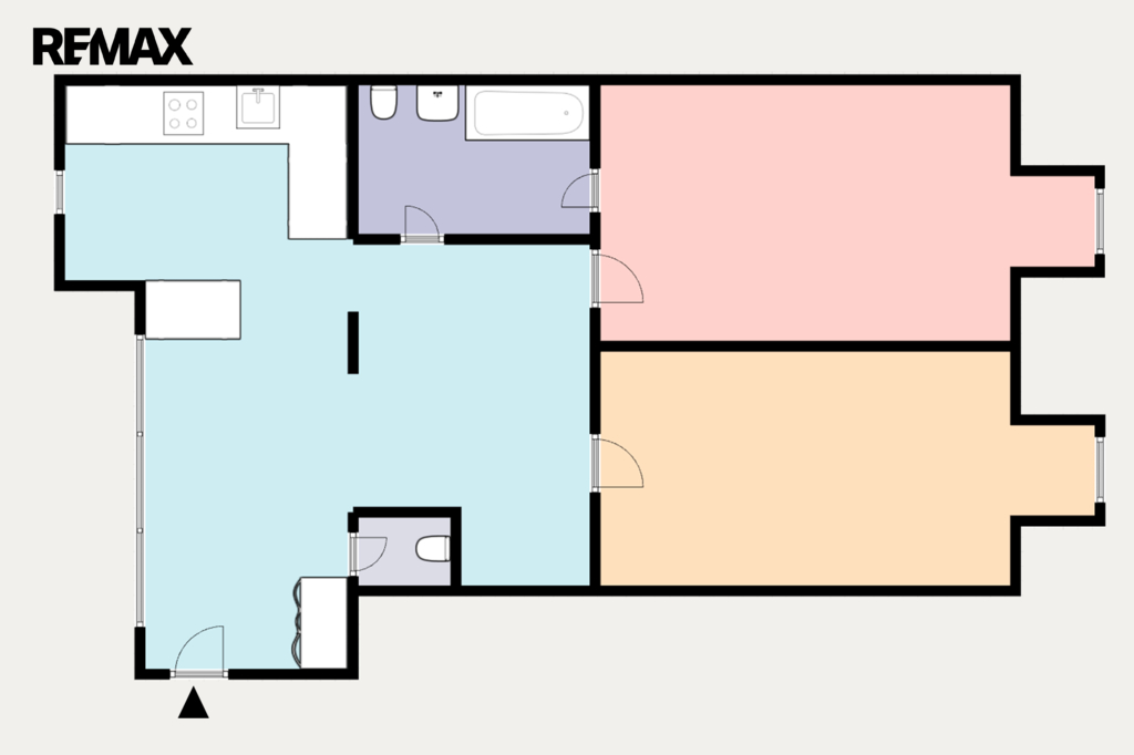 Dispozice bytu zahrnuje prostorný obývací pokoj s kuchyňským koutem a jídelnou (celkem 30,07 m²), dva samostatné pokoje o výměrách 23,10 m² a 22,64 m², dále koupelnu (3,72 m²), samostatné WC (1,26 m²) a předsíň. Okna bytu jsou orientována jak do klidného vnitrobloku, tak do ulice.