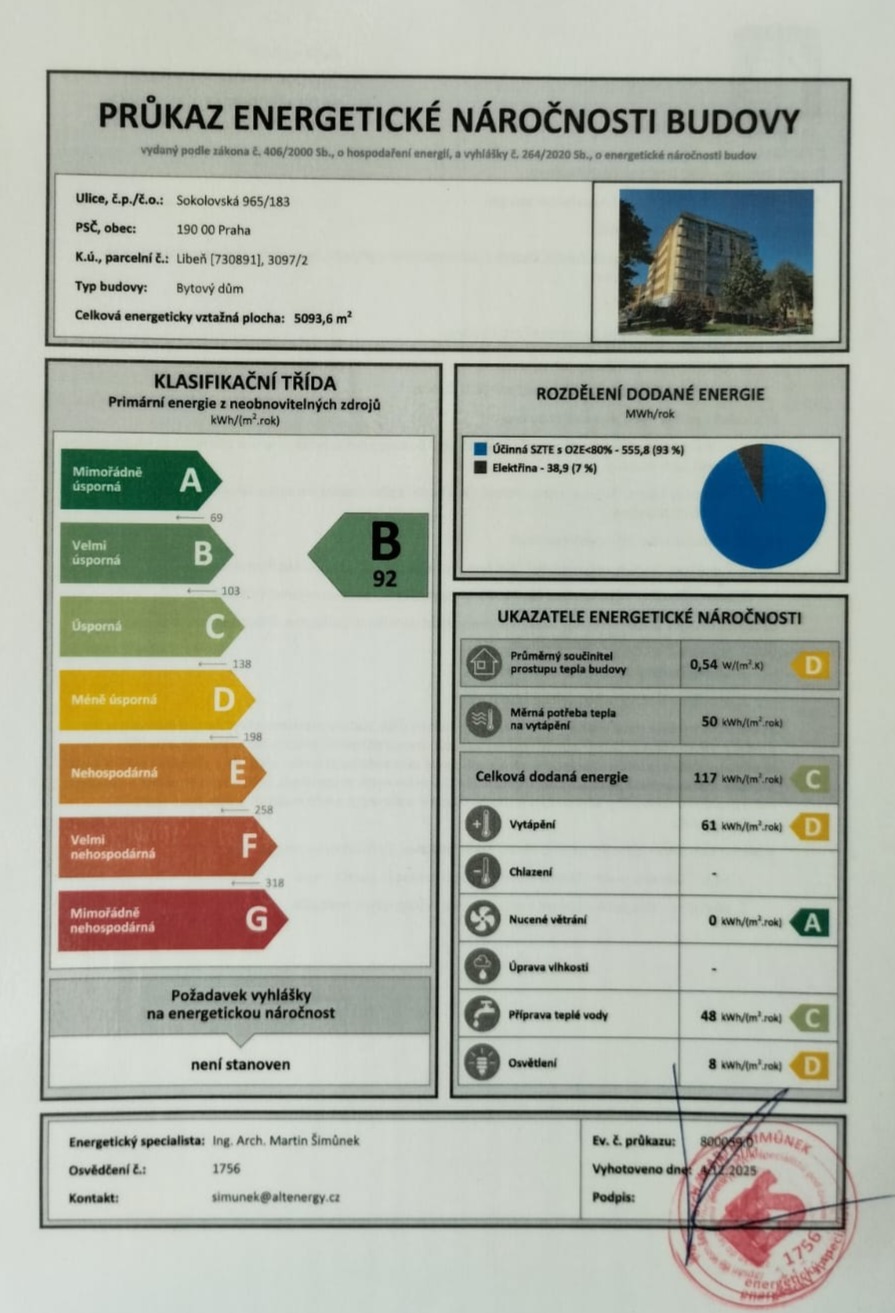 Byt má jihozápadní orientaci a i přes umístění ve zvýšeném přízemí působí díky dostatečné vzdálenosti okolních budov velmi světlým a slunným dojmem. Dům má příznivou energetickou náročnost třídy B, což je významný benefit z pohledu budoucích provozních nákladů. Měsíční předpis činí 6 721 Kč.
