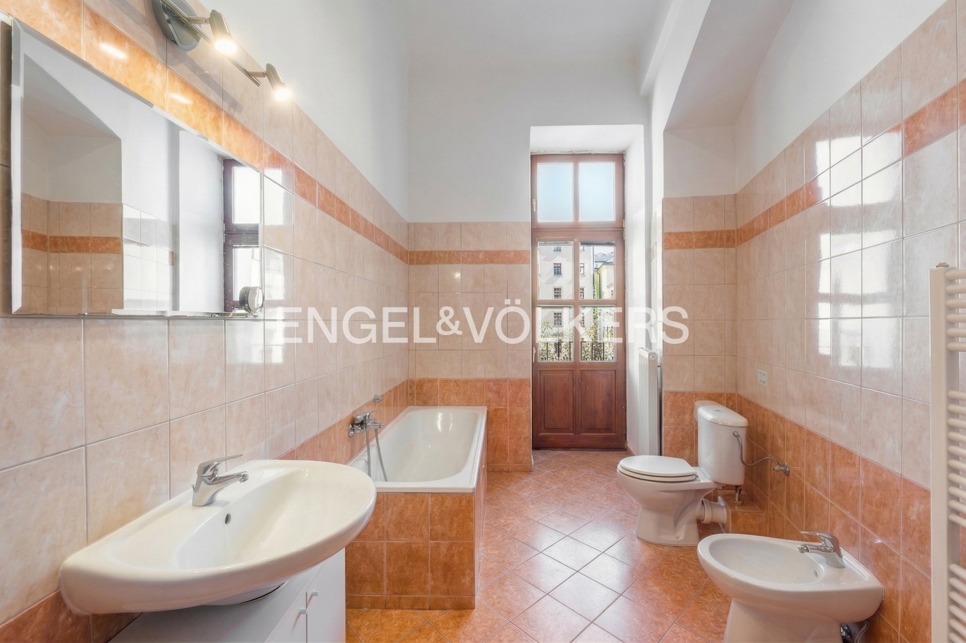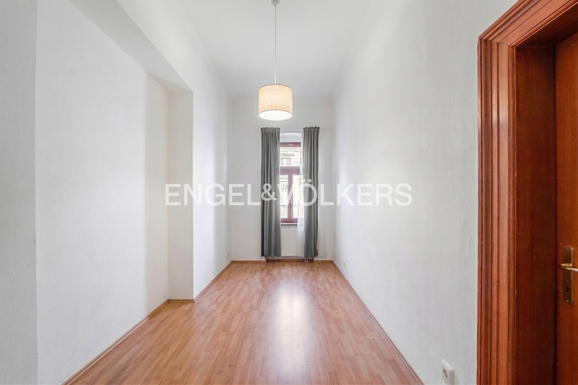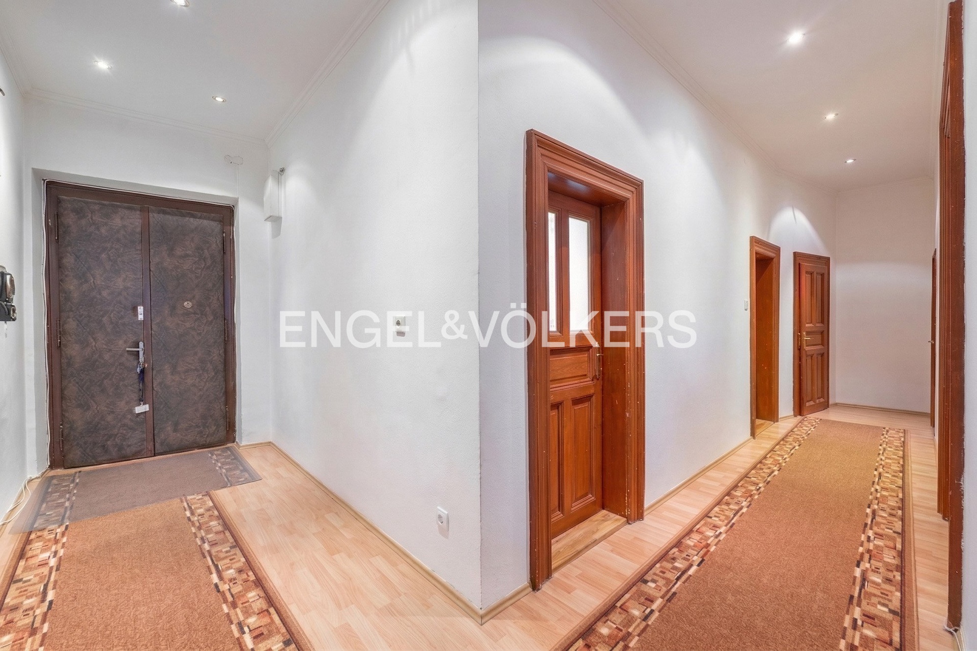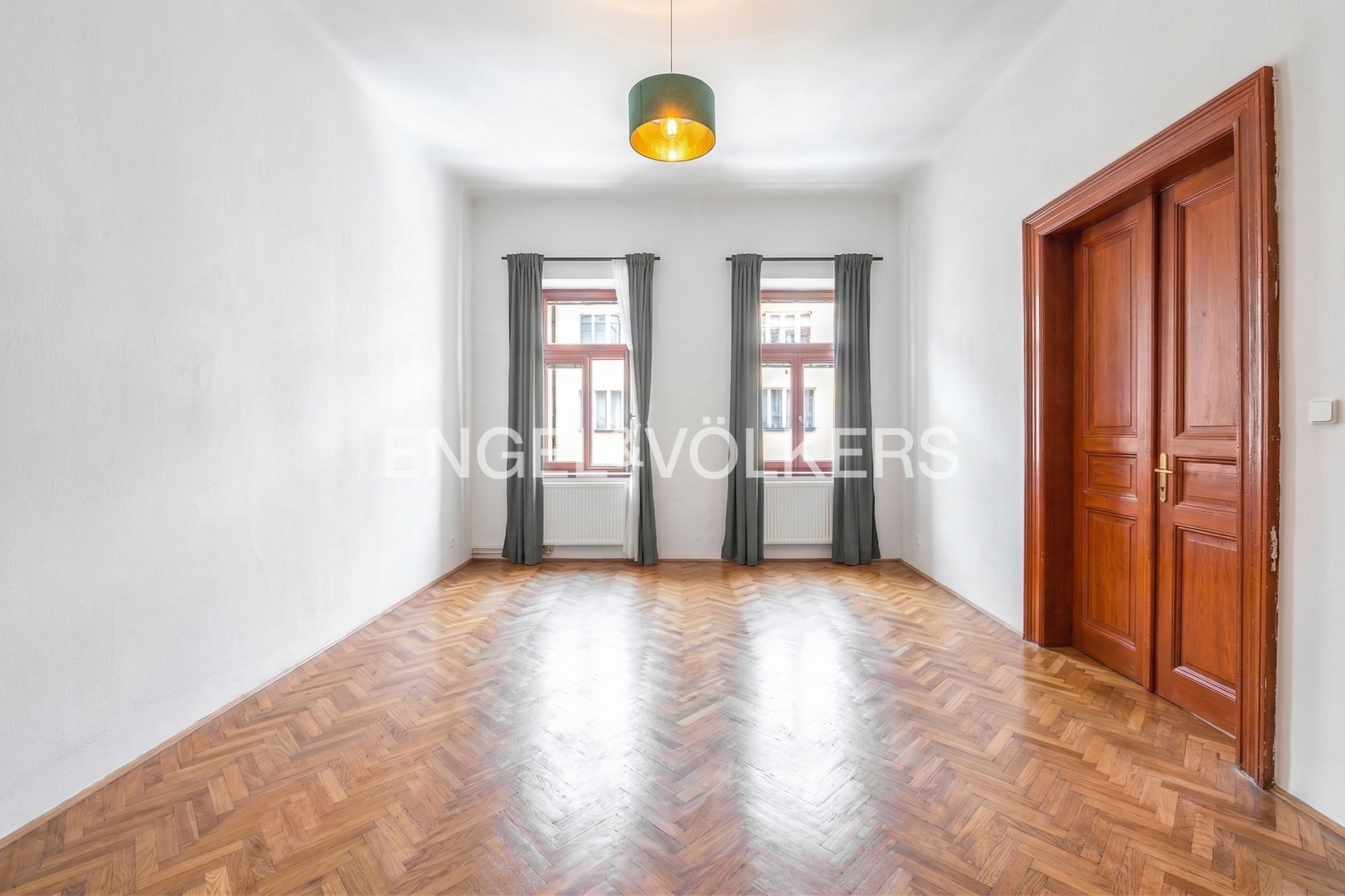 Interiér si zachoval řadu původních prvků, jako jsou vysoké stropy, dřevěná okna s dvojskly nebo typické dvoukřídlé dveře, které dodávají bytu vzdušnost a příjemnou atmosféru. Jednotka je v udržovaném stavu, v pokojích nalezneme parkety, v kuchyni pak plovoucí podlahu. Vytápění a ohřev vody zajišťuje elektrický kotel, v bytě se nachází i plynový sporák. PENB D, měsíční náklady se pohybují kolem 7 000 Kč. Společné prostory domu jsou dobře udržované, zaujmou i krásnými malbami na stropech. K dispozici je také výtah. Dům má zateplenou střechu, fasáda prošla v posledních 10 letech renovací.