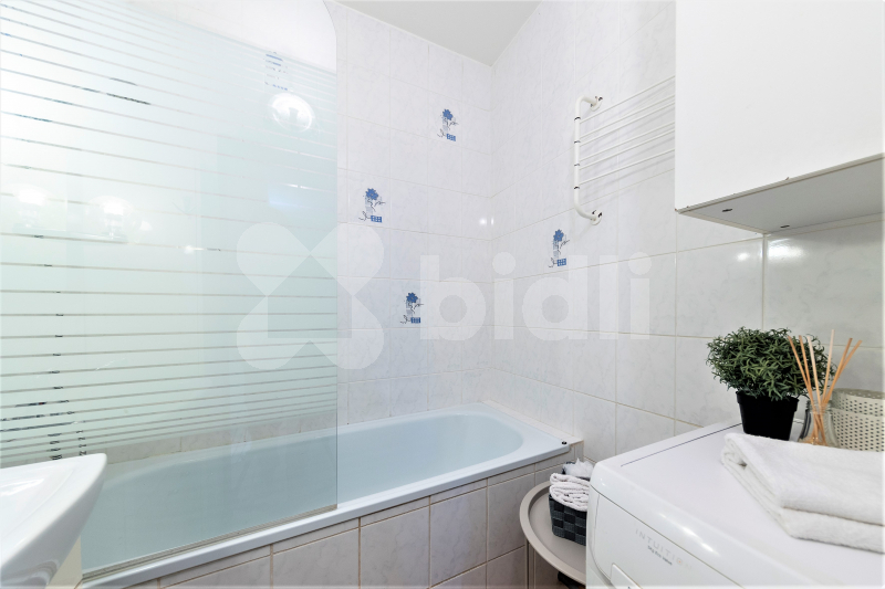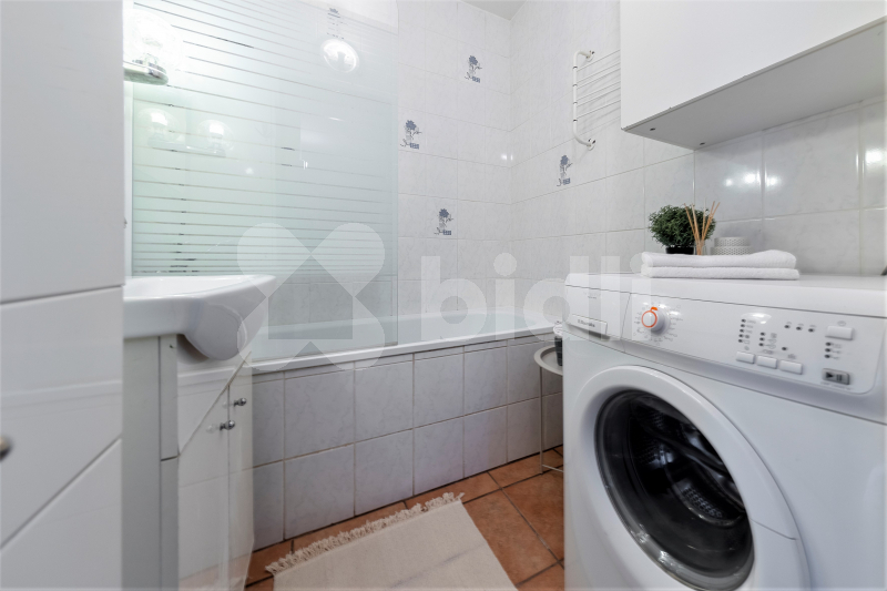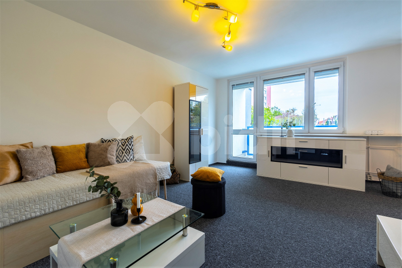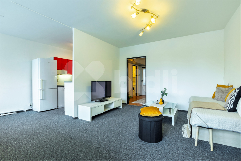 K dispozici je samostatná toaleta a koupelna s vanou a sprchovou clonou, kde je dostatek místa i pro pračku se sušičkou. Dominantou bytu je světlý obývací pokoj s kuchyňským koutem, prakticky a vkusně řešený. Z obývací části je vstup na lodžii, ideální pro ranní kávu nebo večerní relax.