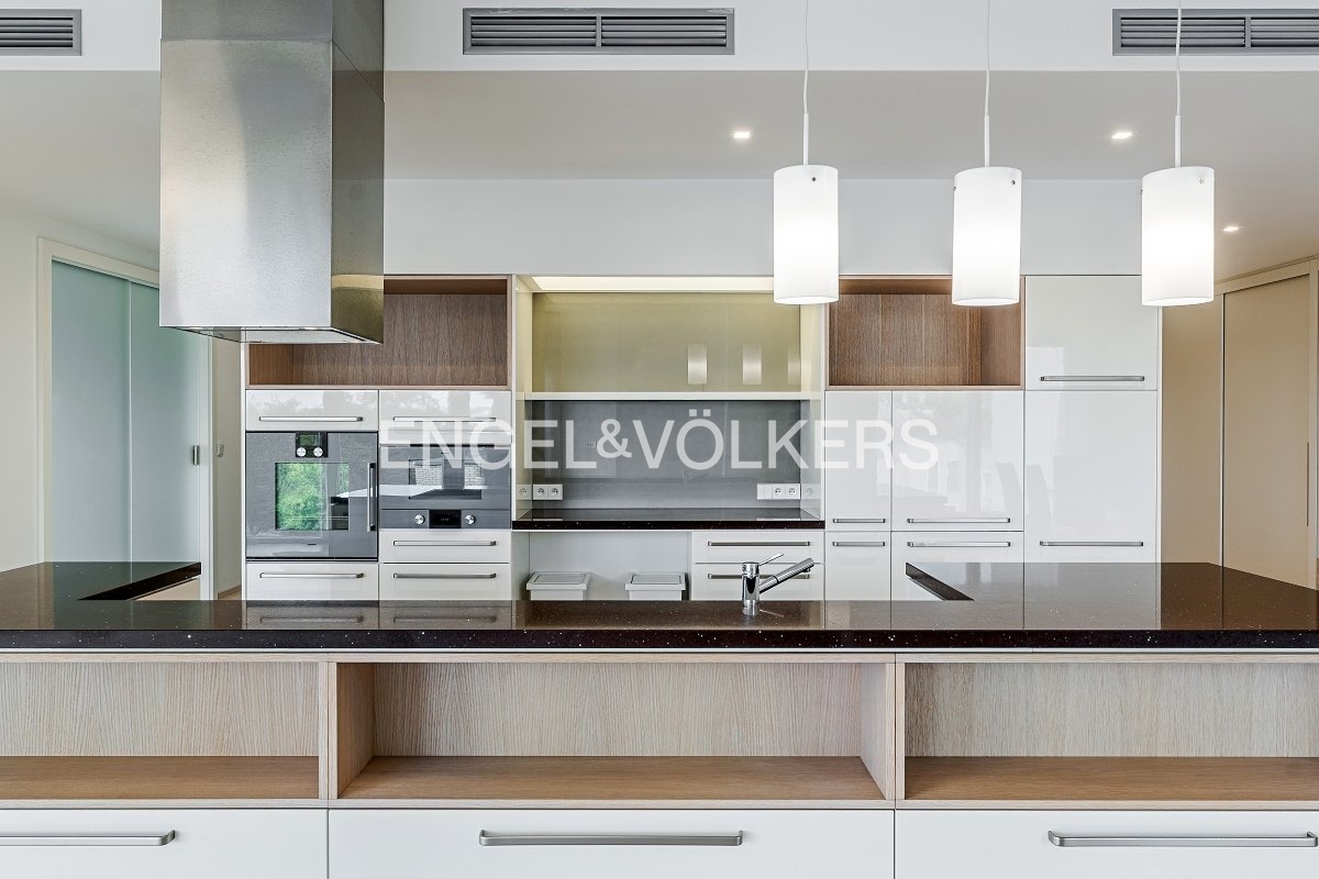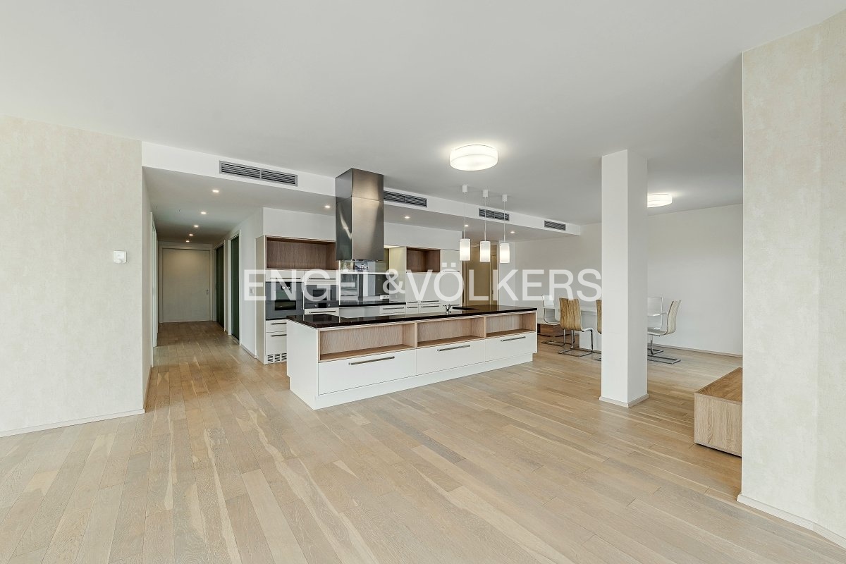 Samotný byt je prakticky rozdělen na společenskou a soukromou část, přičemž každá disponuje vlastní toaletou. Dominantou je světlý obývací pokoj s kuchyní na míru vybavenou špičkovými spotřebiči a přístupem na balkon. Dále byt nabízí dvě samostatné ložnice, z nichž jedna má terasu, prostornou šatnu, koupelnu se sprchovým koutem a vanou, technickou místnost, úložný prostor a dvě toalety.