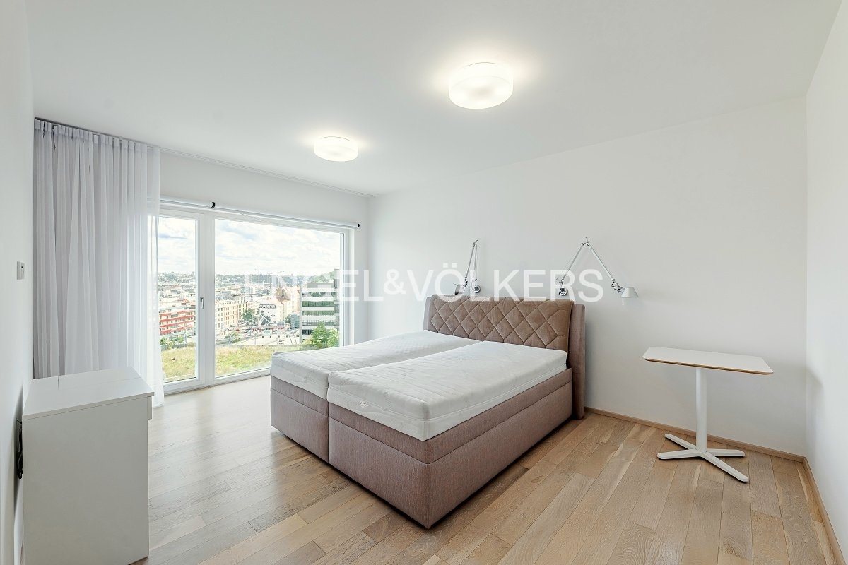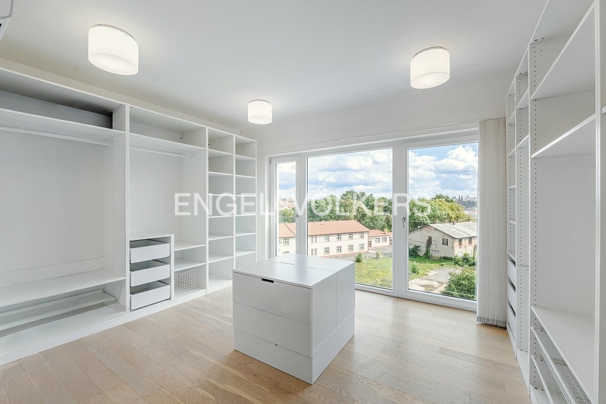 Vysoký standard bydlení podtrhují klimatizace, systém SmartHome, podlahové vytápění, dřevěné podlahy a velkoformátová dřevěná okna orientovaná na jih a východ, odkud se otevírá nádherný výhled na Prahu. K bytu náleží sklepní kóje a parkovací místo v podzemní garáži.
