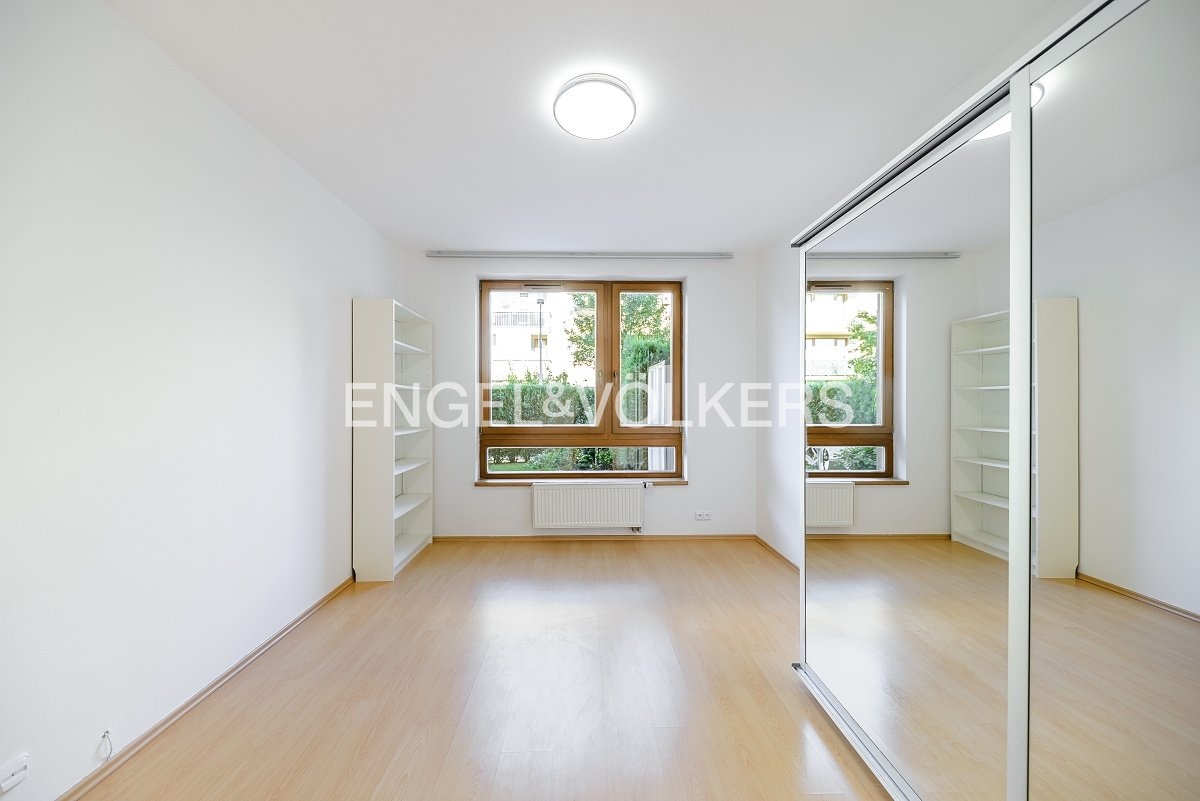 Byt je prakticky řešený tak, že vcházíte přes předsíň, která disponuje velkou vestavěnou skříní a oddělenou toaletou. Obývací pokoj s přímým vstupem na terasu se zahradou a kuchyňskou linkou kompletně vybavenou všemi spotřebiči. Ložnice je s velkou skříní a en-suite koupelnou. Byt se pronajímá nezařízený.