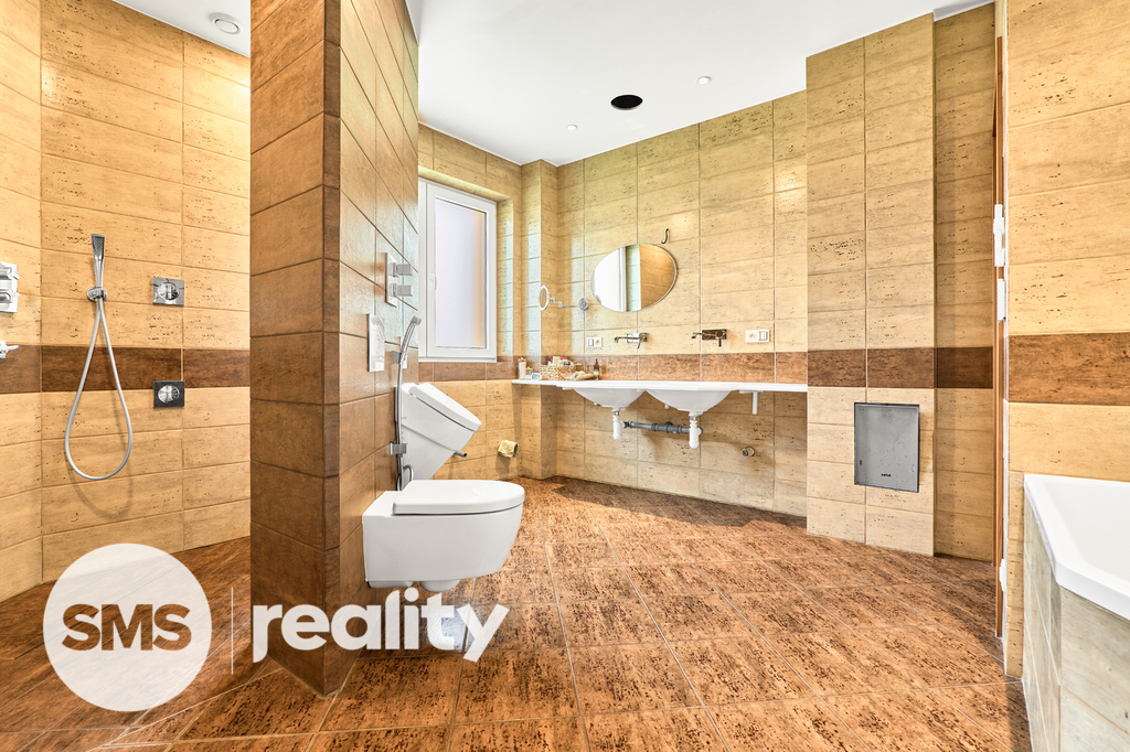 2. NP (patro): tři ložnice, každá s vlastní šatnou (walk-in), velká koupelna s toaletou a sprchovým koutem, samostatná toaleta, pracovna.