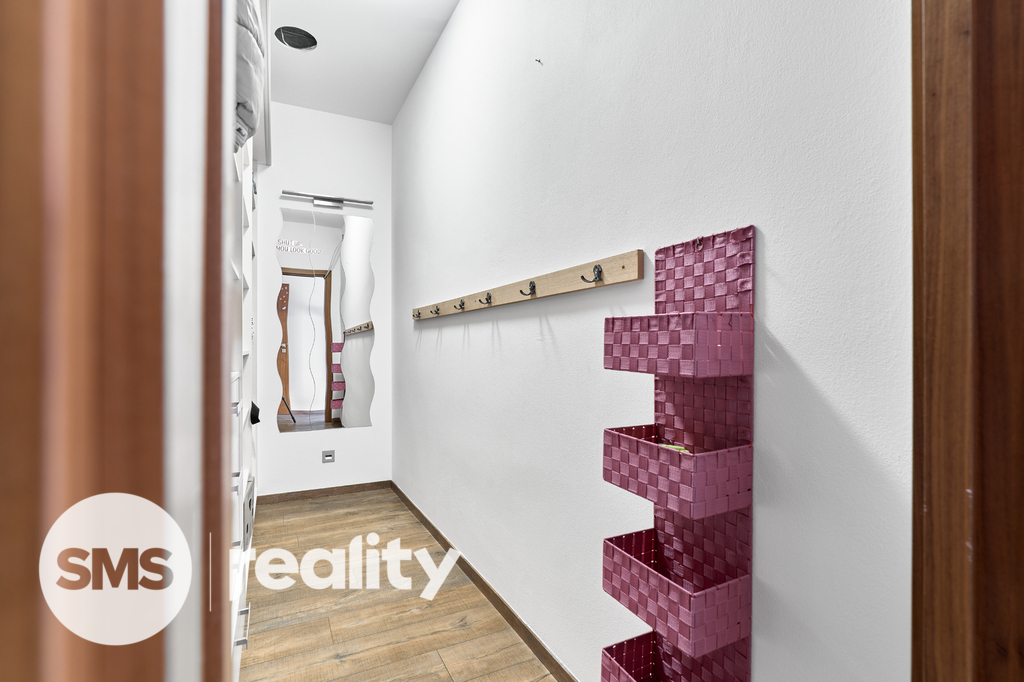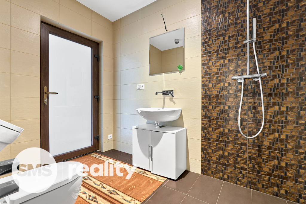 Unikátní je propojení garáže přes velkou spižírnu přímo do kuchyně. Prostorná garáž je určena pro 2 vozy (výška 2,4 m) a ještě zbude úložný prostor + další 2 místa na pozemku za elektrickou bránou. Předsíň nabízí dostatek úložných prostor a koupelna disponuje sprchou, toaletou a pisoárem.