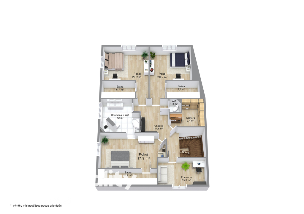 • 2. NP (Klidová zóna): Tři ložnice, každá s vlastní walk-in šatnou. Hlavní koupelna je vybavena kameninovým dvojumyvadlem na míru, sprchou i vanou. Dále zde najdete pracovnu (hostinský pokoj) a komoru.