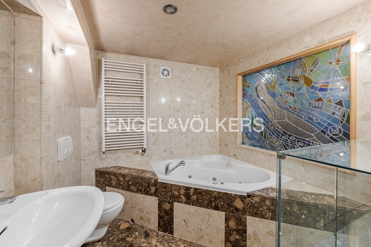 V hlavní koupelně je masážní vana s toaletou, kuchyně je plně vybavená spotřebiči. Byt dále disponuje menším samostatným pokojem s vlastním sprchovým koutem a toaletou.
