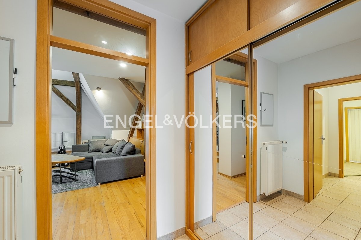 V bytě jsou přiznané podkrovní trámy, které dodávají bytu kouzlo a charakter půdní vestavby.