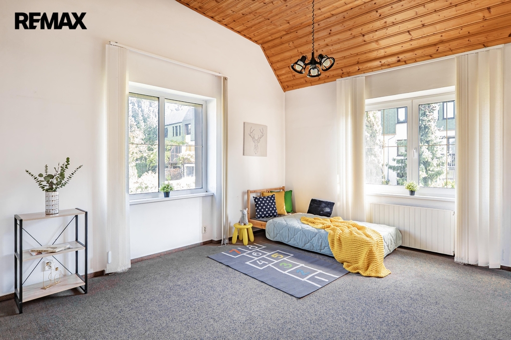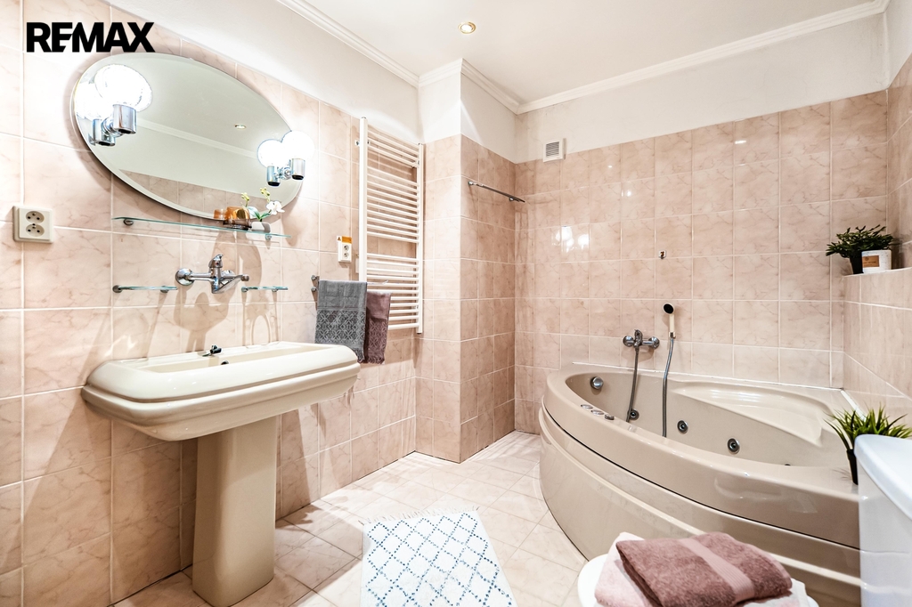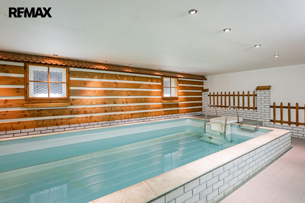 V podzemním podlaží najdete místnost s vnitřním bazénem Desjoyaux, kde se můžete koupat po celý rok. Dále se dům skládá ze dvou nadzemních podlaží a obytného podkroví. Interiér je vybaven kuchyňskou linkou se spotřebiči a dohromady tady máte 4 koupelny a toalety. Samozřejmě nechybí plastová okna. Přes celou šířku domu je balkon s výhledem do ulice a na opačné straně menší balkon s pohledem do zahrady.