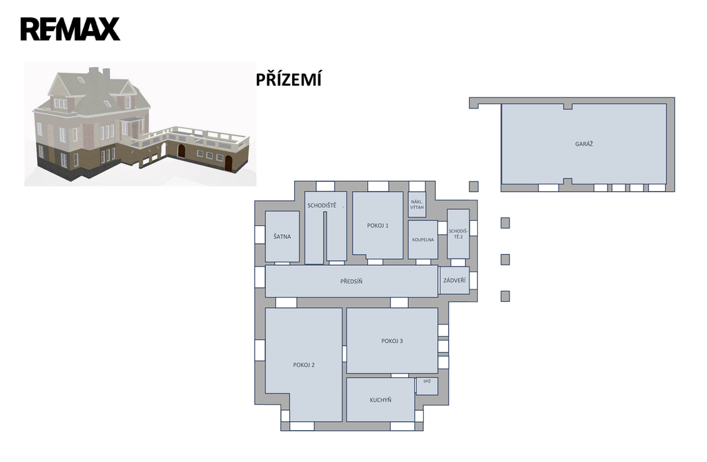 Parkování zajišťuje prostorná garáž pro 2 vozy s možností dalšího stání přímo na pozemku.